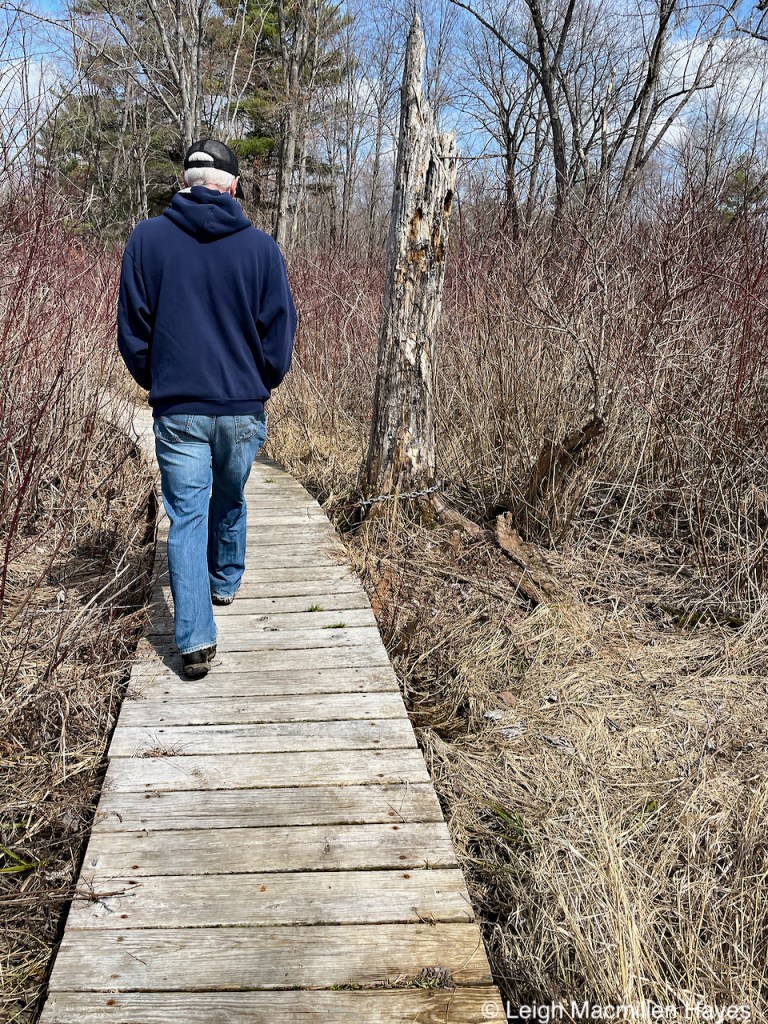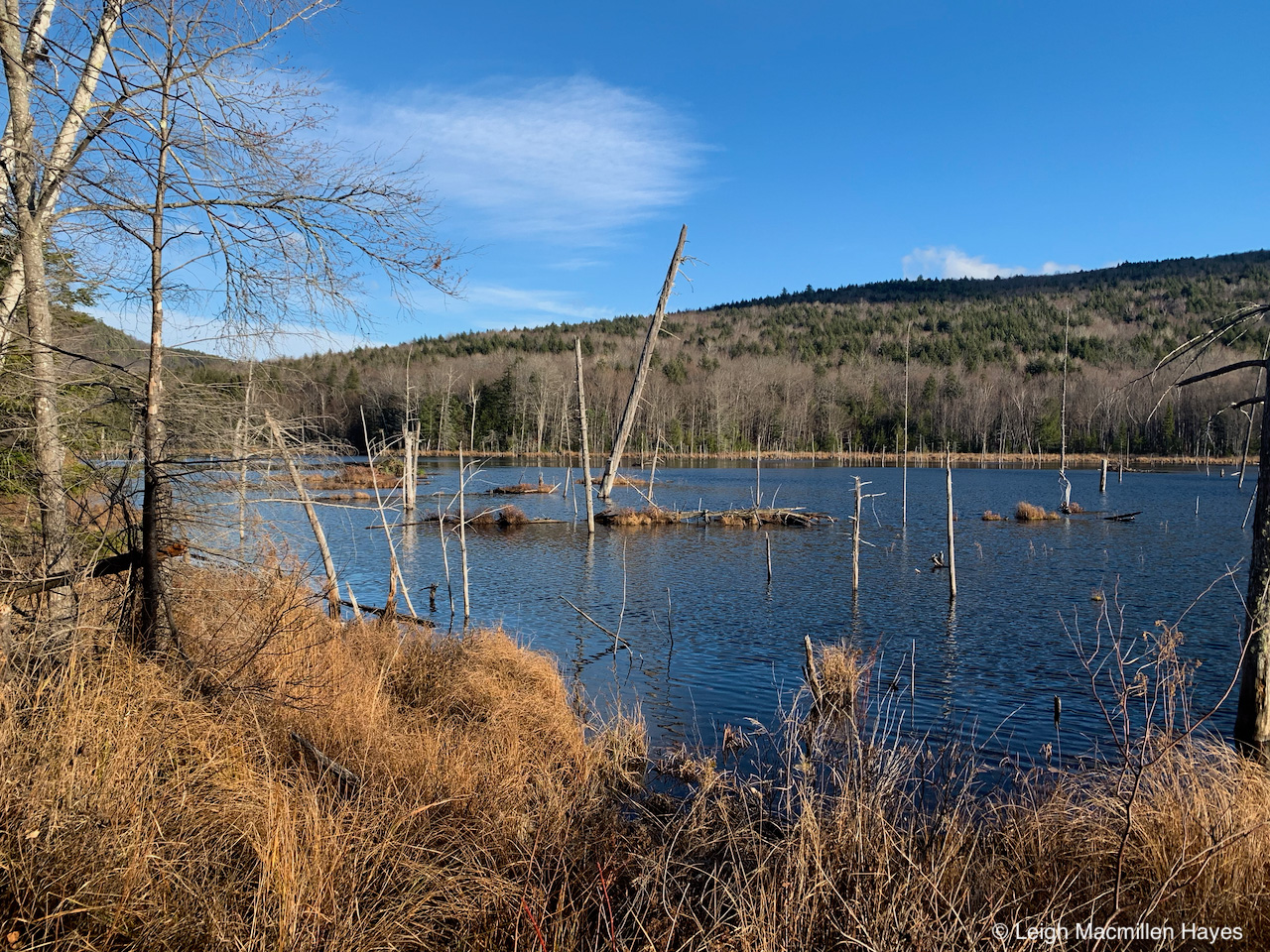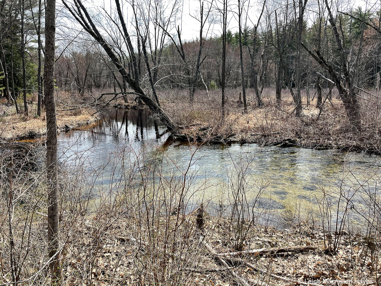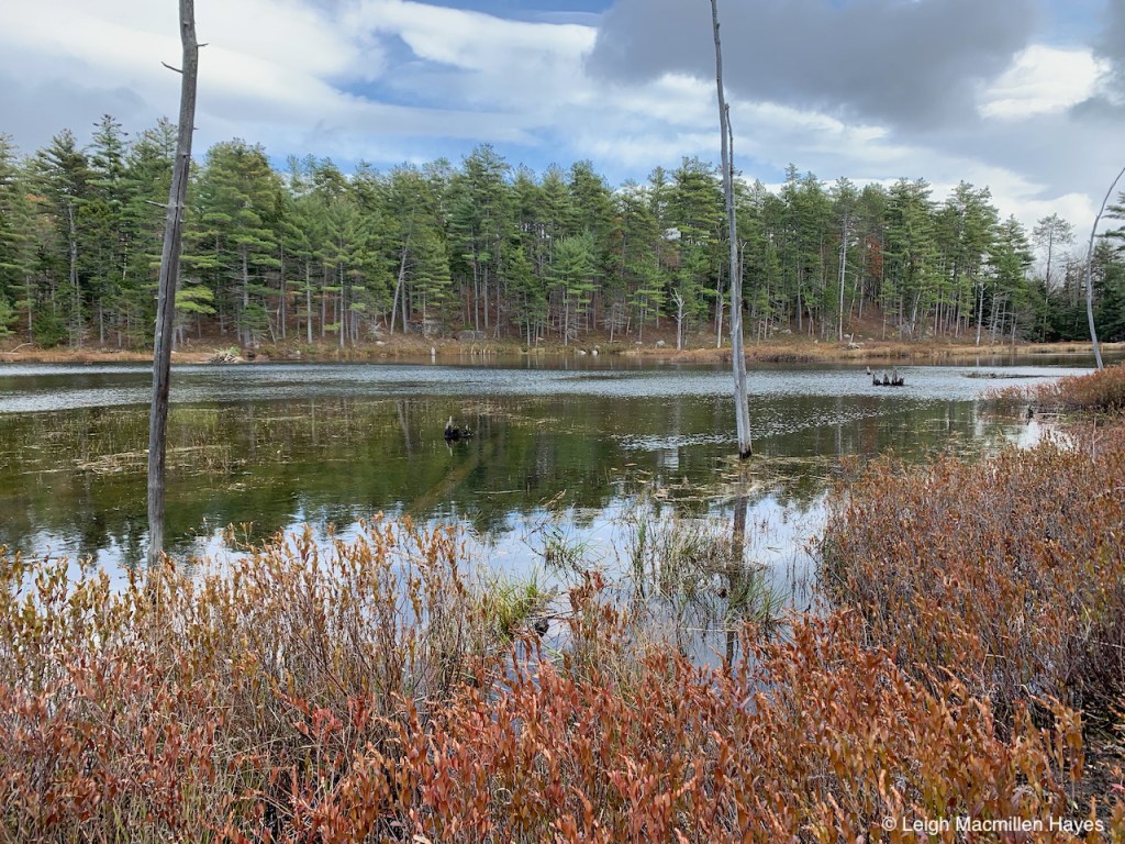 Eventually, we pulled ourselves away because there was more water to meet, though we were surprised to arrive at a closed gate. No signs forbid our trespass and so we walked around the gate, and up the dirt road to the parking area and kiosk. On the way, we could hear a machine being operated and wondered if we’d stumbled upon a logging operation. A few minutes further along, a young man with an easy grin pulled up in a pick-up truck and knowing that the gate behind us was closed, we figured he must have something to do with the property. Sure enough, he told us they were working on the roadway and bike path ahead. The gate is closed for hunting season, but will reopen in the winter. Still, we were welcomed to hike on.