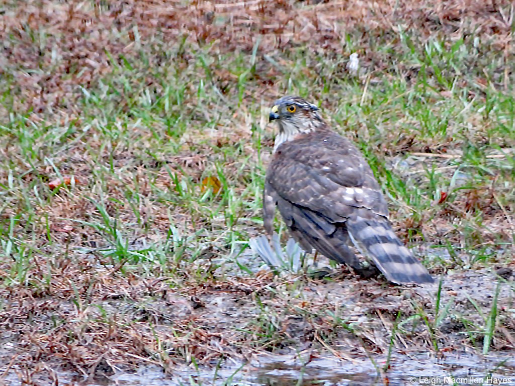Two hours later, I spotted the hawk on our stonewall and later went out to search for feeding evidence as chipmunks and other small mammals are also part of their diet. I found only a couple of downy feathers where the bird had stood in the yard and nothing by the stonewall, but I suspect there may be something to notice in the future.