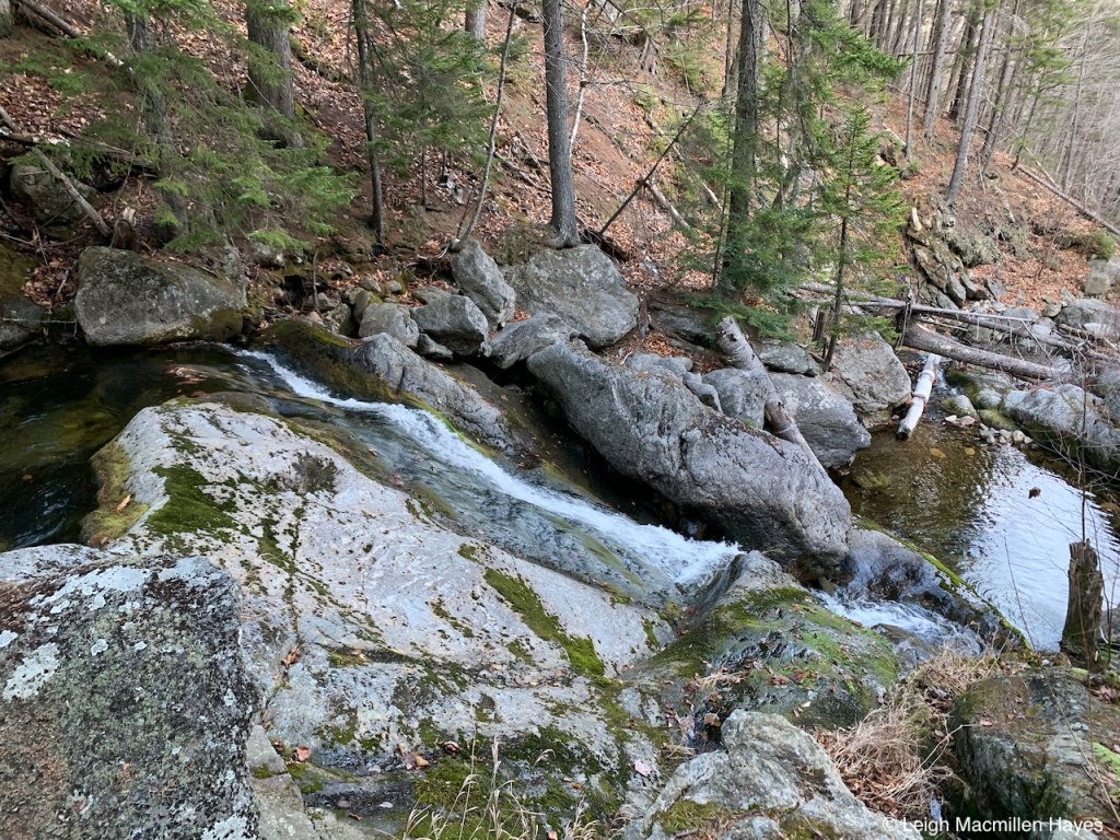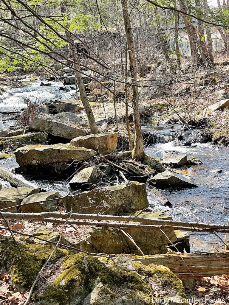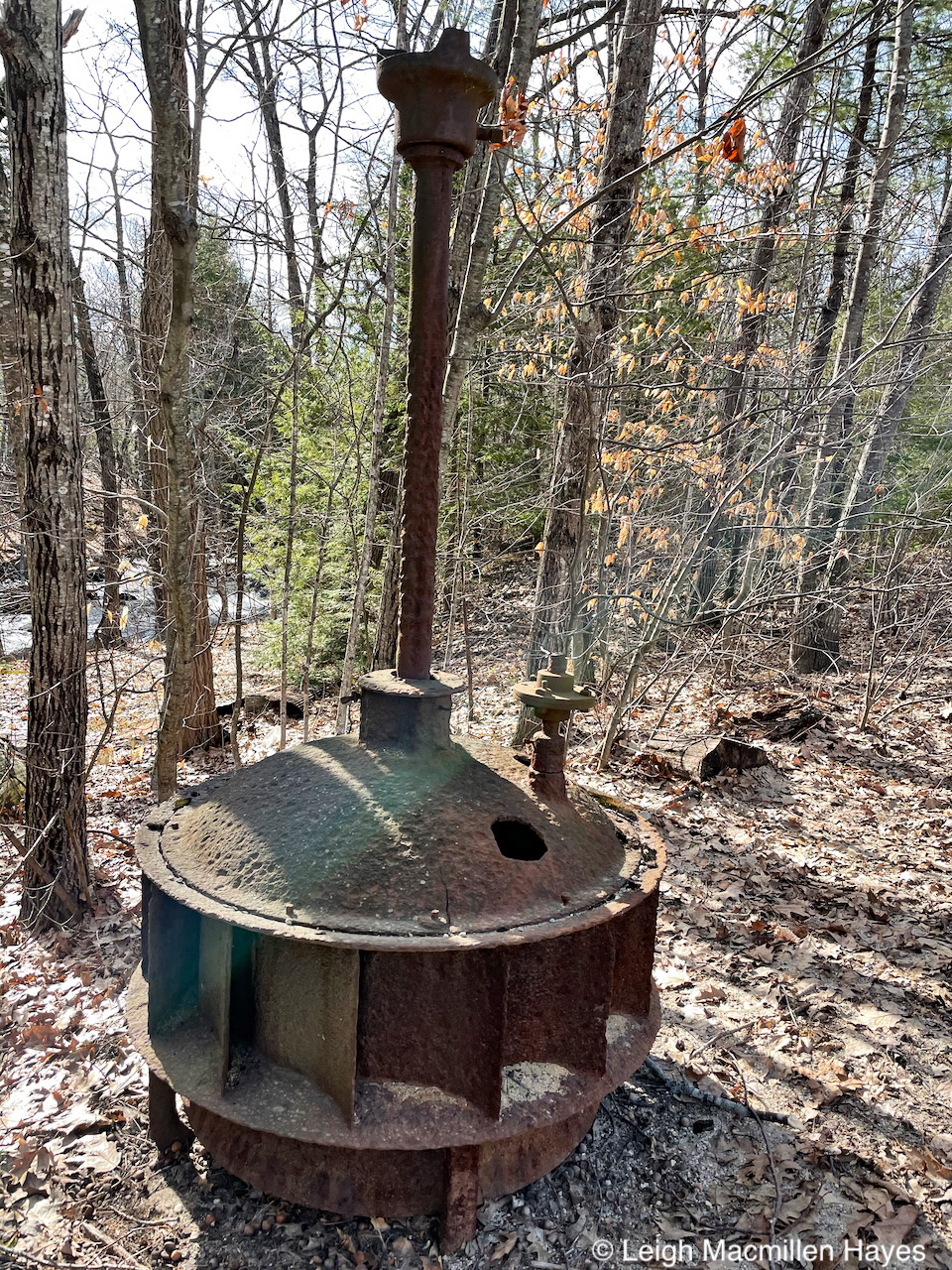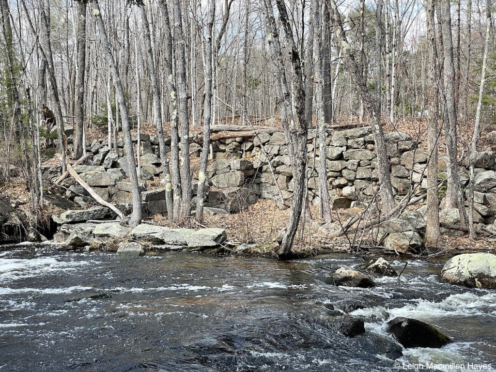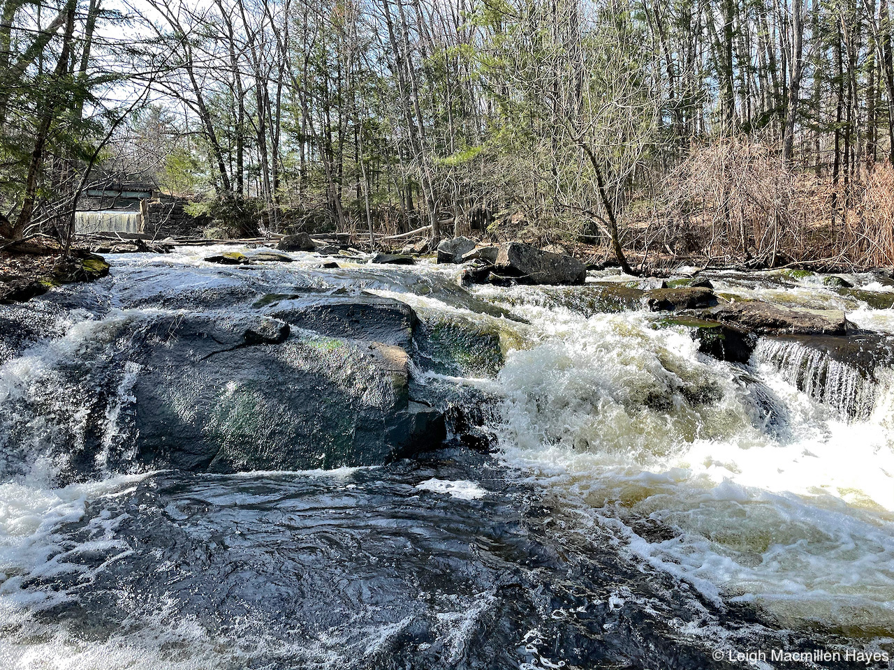 Faded interpretive signs told the story of the past, but I only skimmed those. What I did learn was that the foundation upon which I stood had once been a powerhouse, thus the importance of the water flowing from above for saw mills, grist mills and such. And as I stood there, I noted the structures that once supported a penstock and then the location of a turbine that must have been situated within the powerhouse and I gave thanks to my friend Sue Black (RIP Sue) who long ago helped me gain a better understanding of these structures along Stevens Brook Trail in Bridgton, Maine. As serendipity would have it, her son, Andrew, had contacted me only a few hours earlier about an unusual natural sighting he’d made.