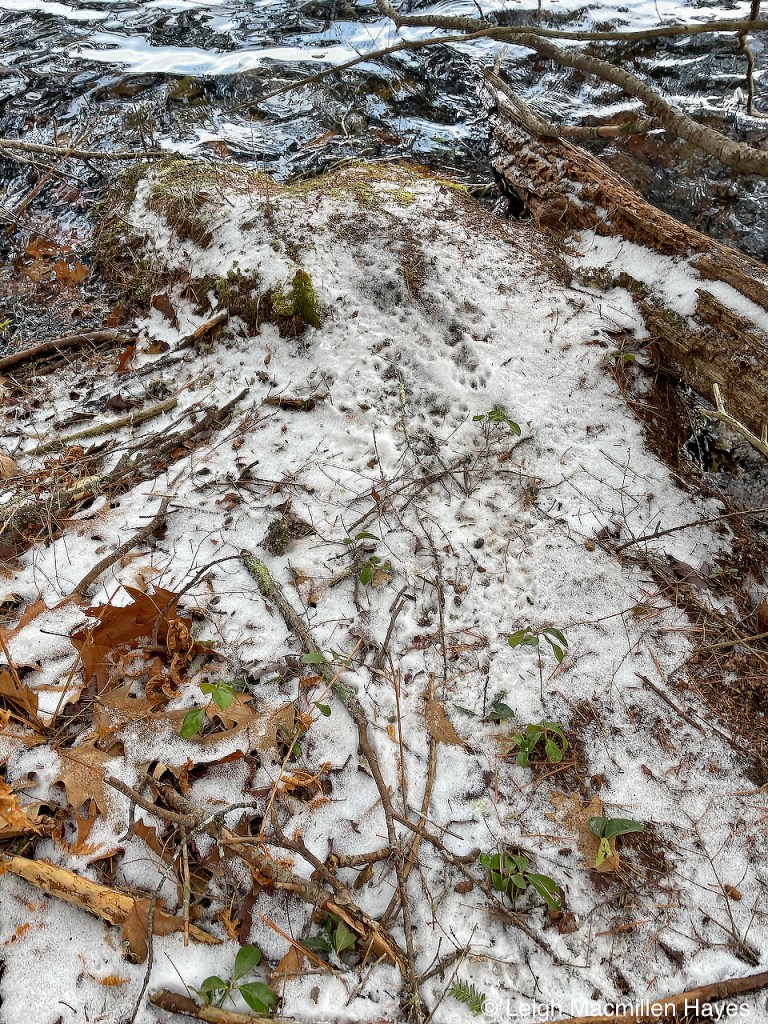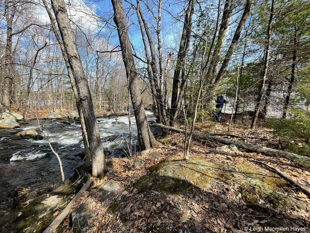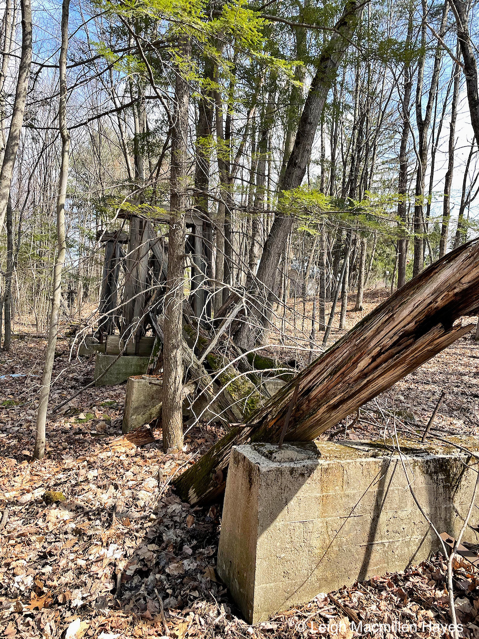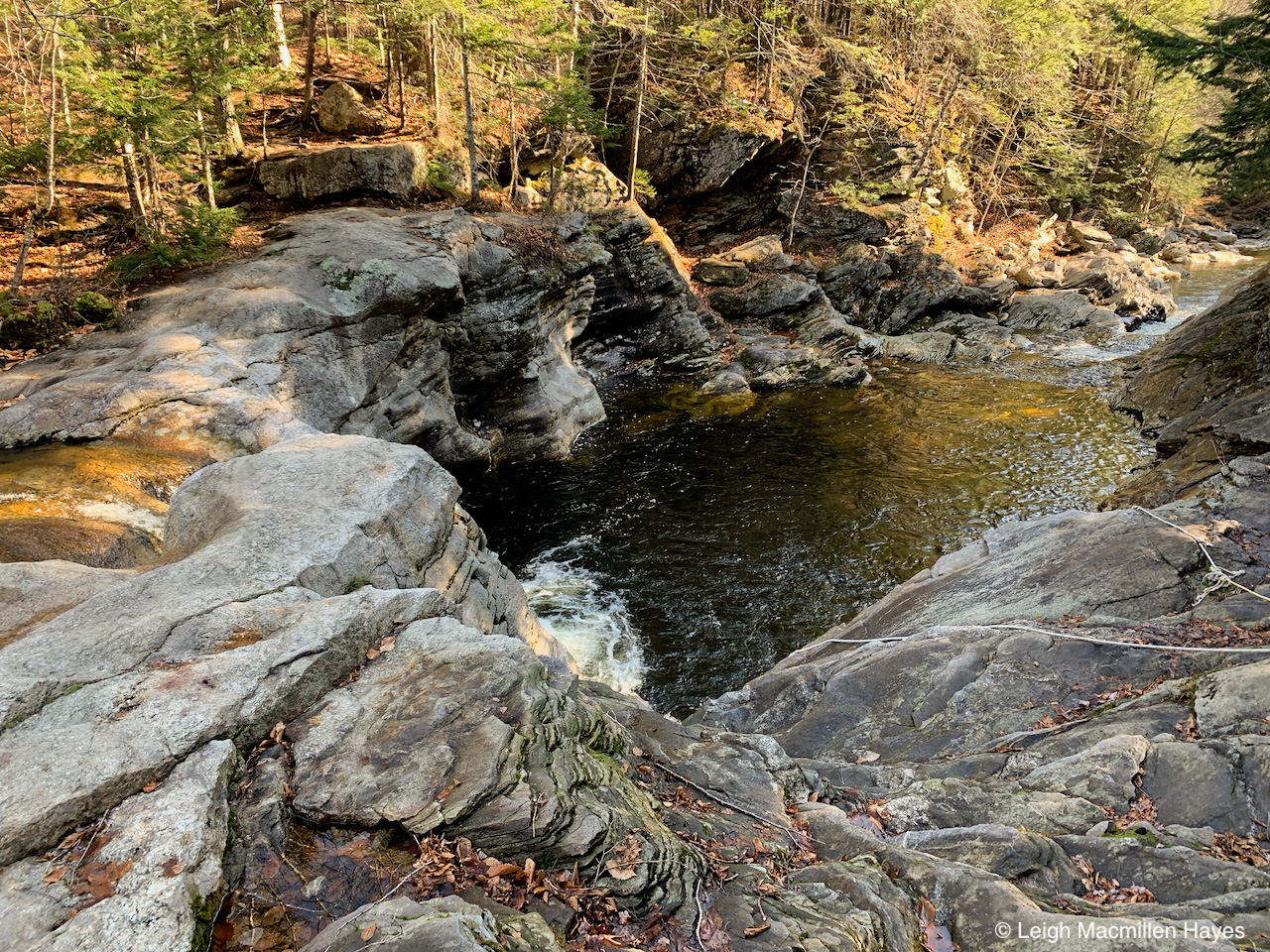 Faded interpretive signs told the story of the past, but I only skimmed those. What I did learn was that the foundation upon which I stood had once been a powerhouse, thus the importance of the water flowing from above for saw mills, grist mills and such. And as I stood there, I noted the structures that once supported a penstock and then the location of a turbine that must have been situated within the powerhouse and I gave thanks to my friend Sue Black (RIP Sue) who long ago helped me gain a better understanding of these structures along Stevens Brook Trail in Bridgton, Maine. As serendipity would have it, her son, Andrew, had contacted me only a few hours earlier about an unusual natural sighting he’d made.