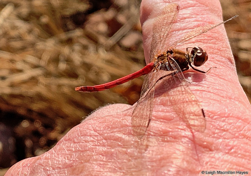 No maybes about it because this Autumn Meadowhawk took a while, but eventually let me coax it onto my hand today. Why is it still flying? Maybe because we did have a warm up this past week, though the past two mornings Jack Frost has visited. Whatever the reason, it certainly took us by surprise on this November day.