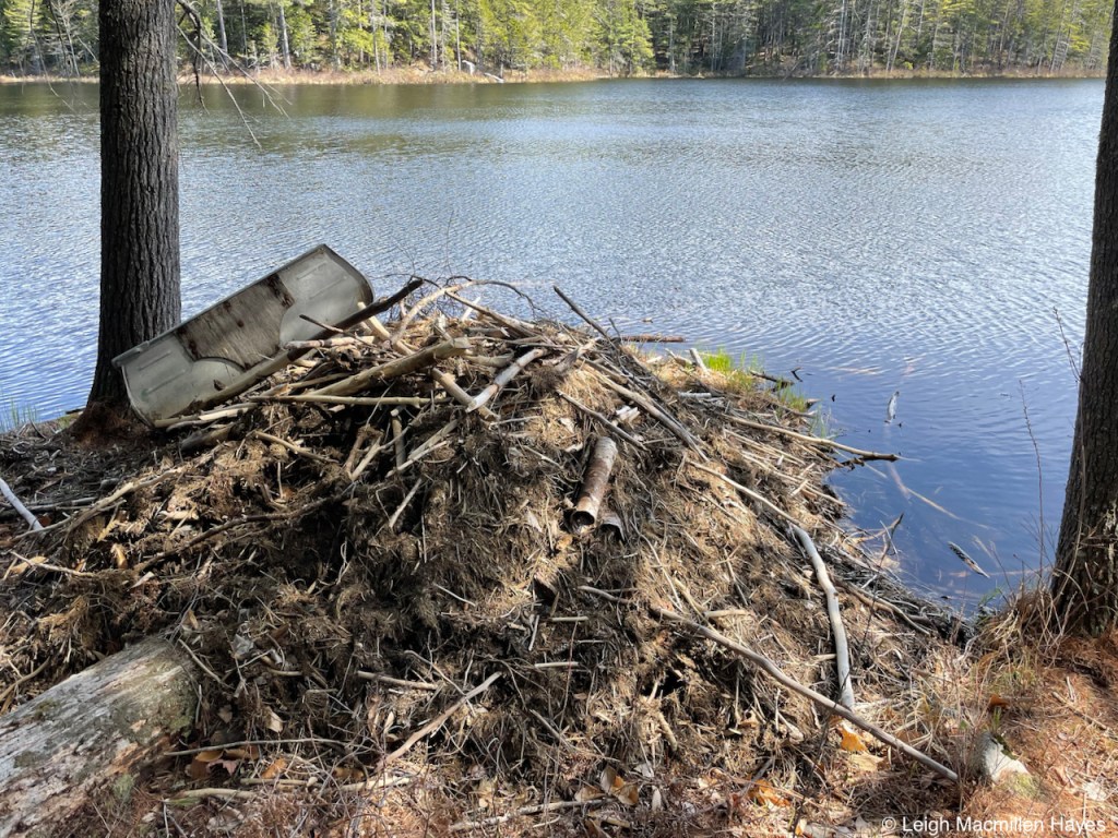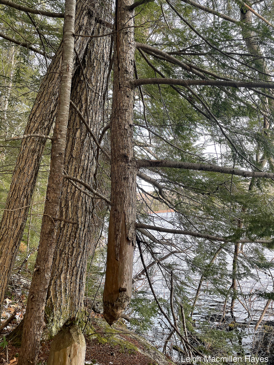 I stopped a few more times, but finally reached the spot that was my second intention of the day. While exploring in this area a couple of week’s ago with several Greater Lovell Land Trust docents, we noticed beaver trees. The work looked rather recent and so we set up a game cam in hopes of getting a view of the perpetrator.