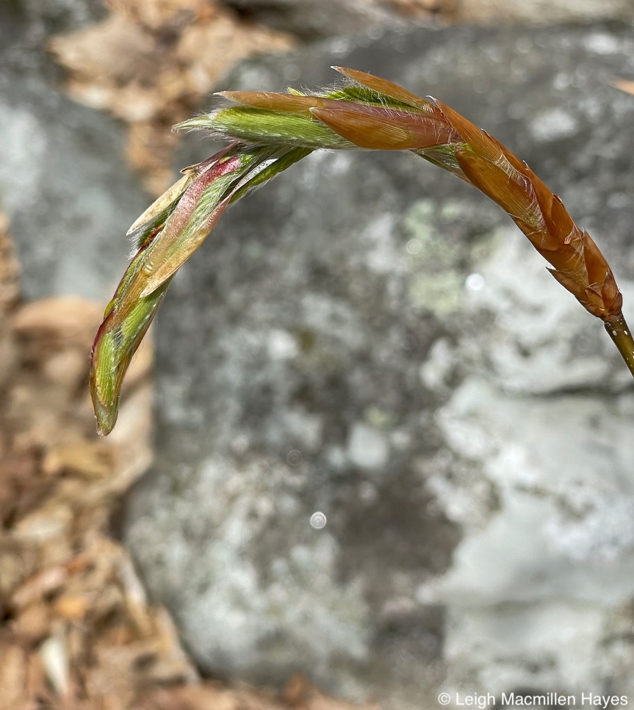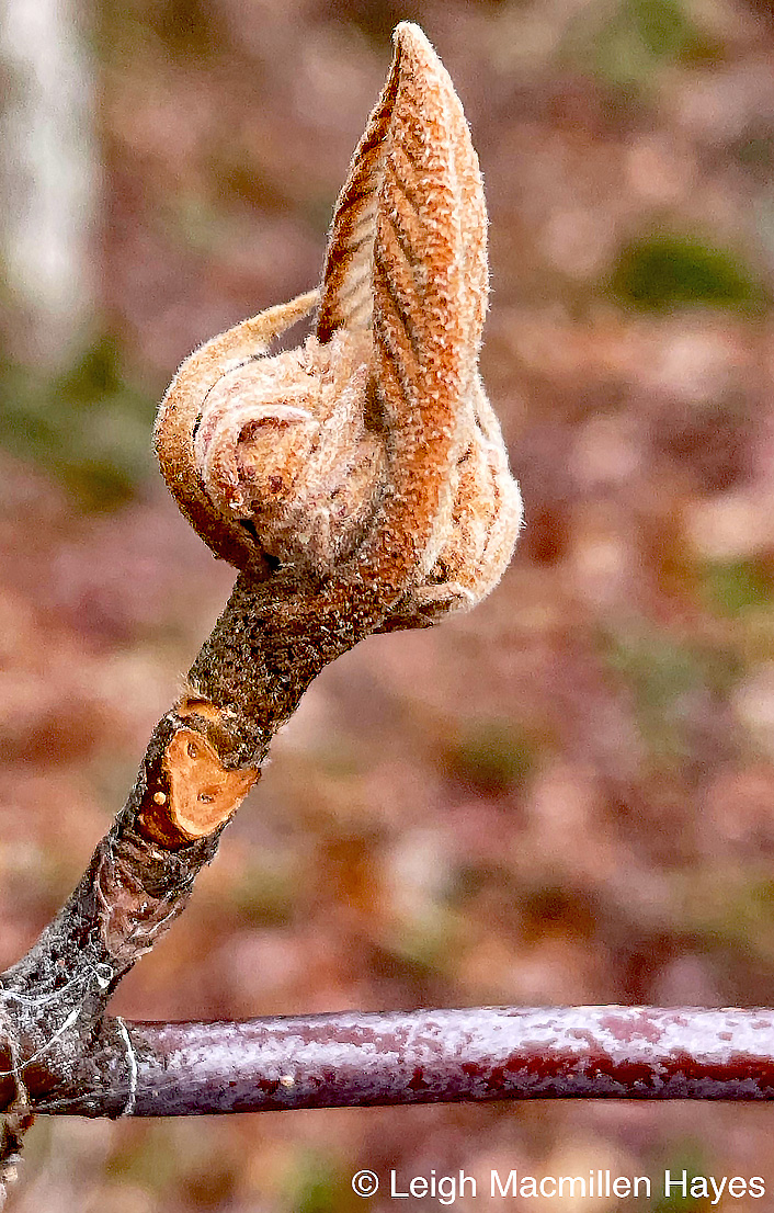 At the summit, it was Serviceberry, aka Shadbush, that announced its presence. Notice how the flowers have emerged before the leaves. Right now, mini-leaves are bronze-tinged, folded and half or less their mature size; eventually the leaves will become green and flat, with the upper surface smooth and the lower hairy just along the midrib but retaining a few hairs on the surface. Nothing like a bit of variation.