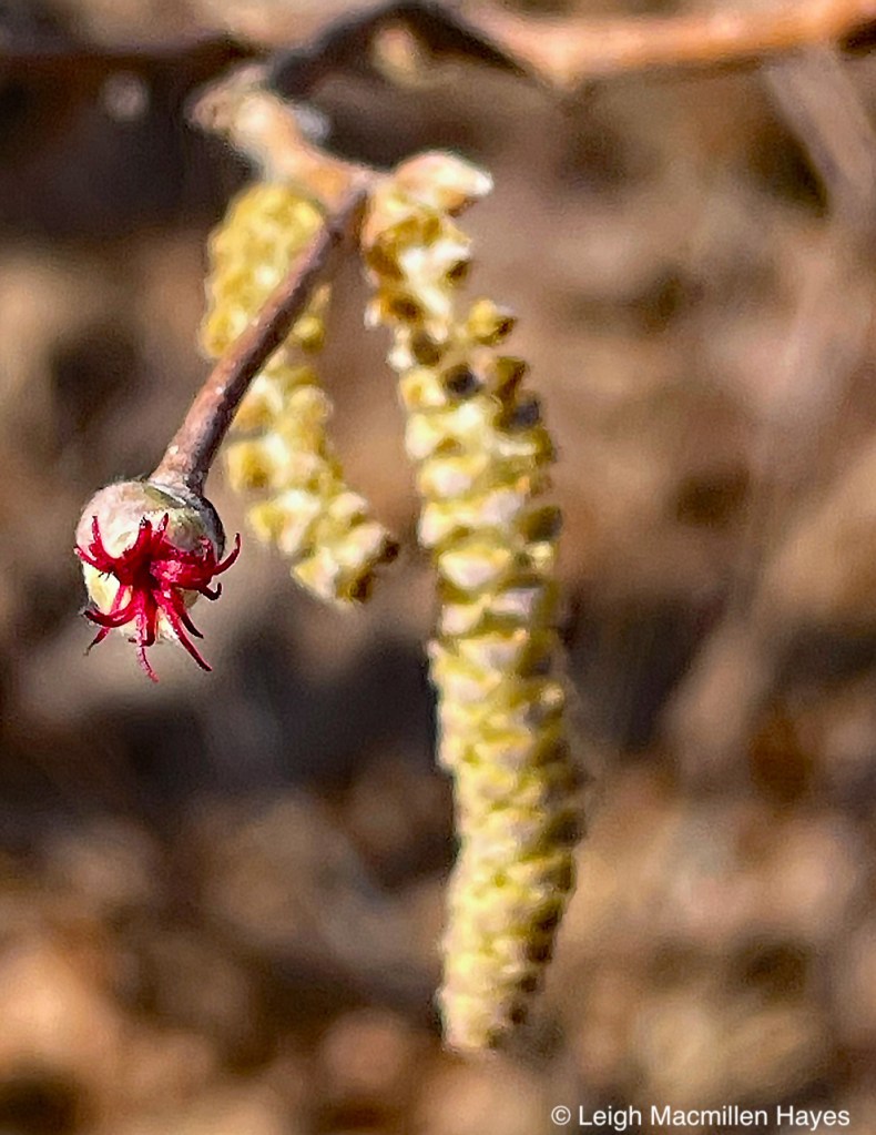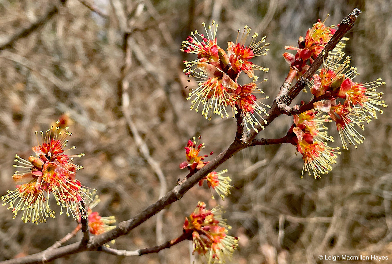 The power of others who grow beside the brook is displayed like daylight fireworks, that being the male Red Maple flowers–their anthers yellow with pollen awaiting dispersal.