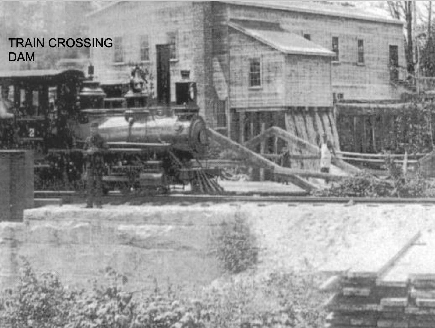 The split stone dam was erected in 1858 by Rufus Gibbs and others, thus providing power for the first big mill in the village that stood four stories tall, employed 50 workers, ran 20 looms and made blankets for the Civil War. By 1941, is was demolished.