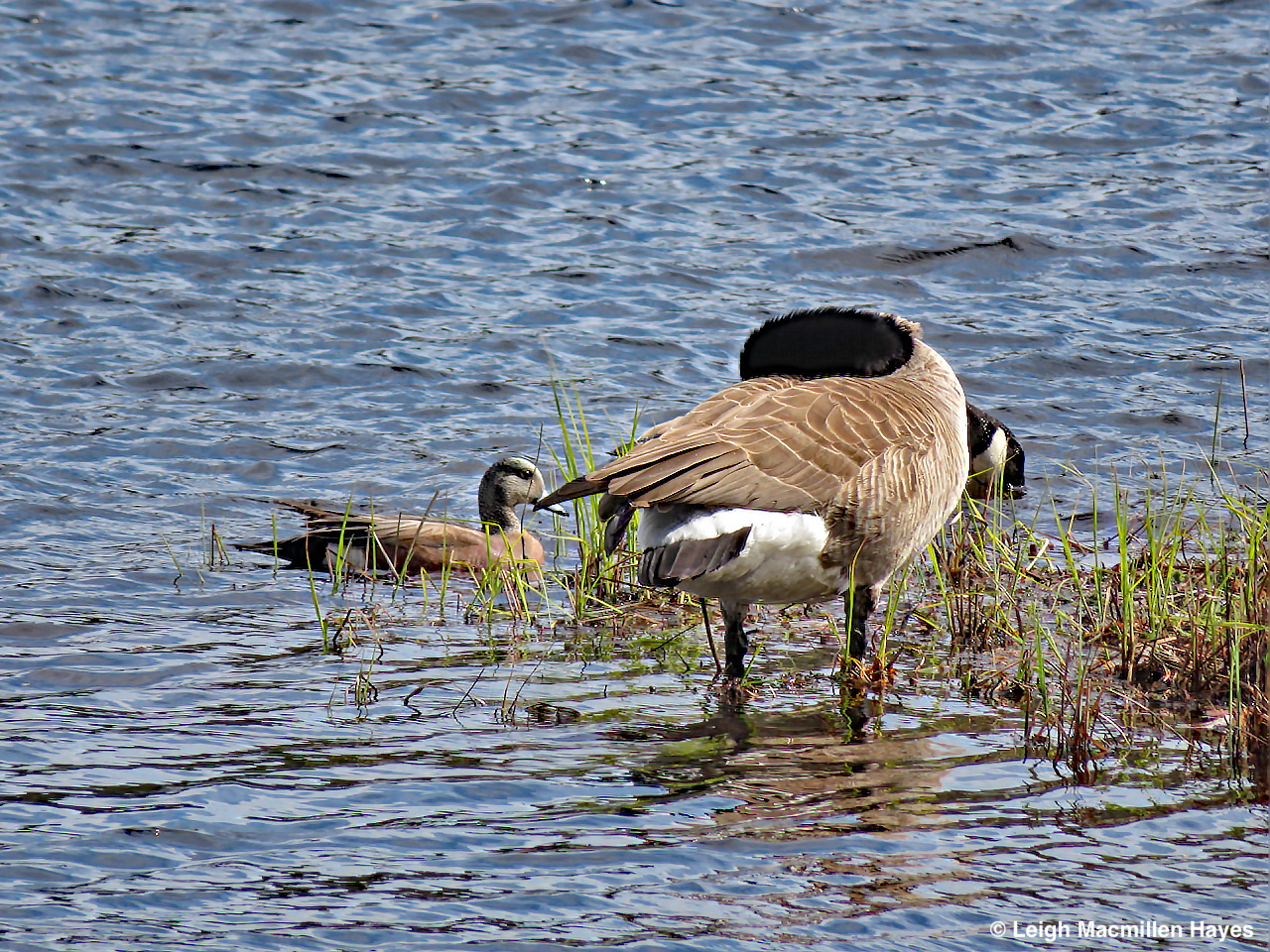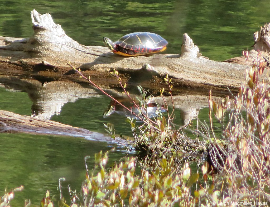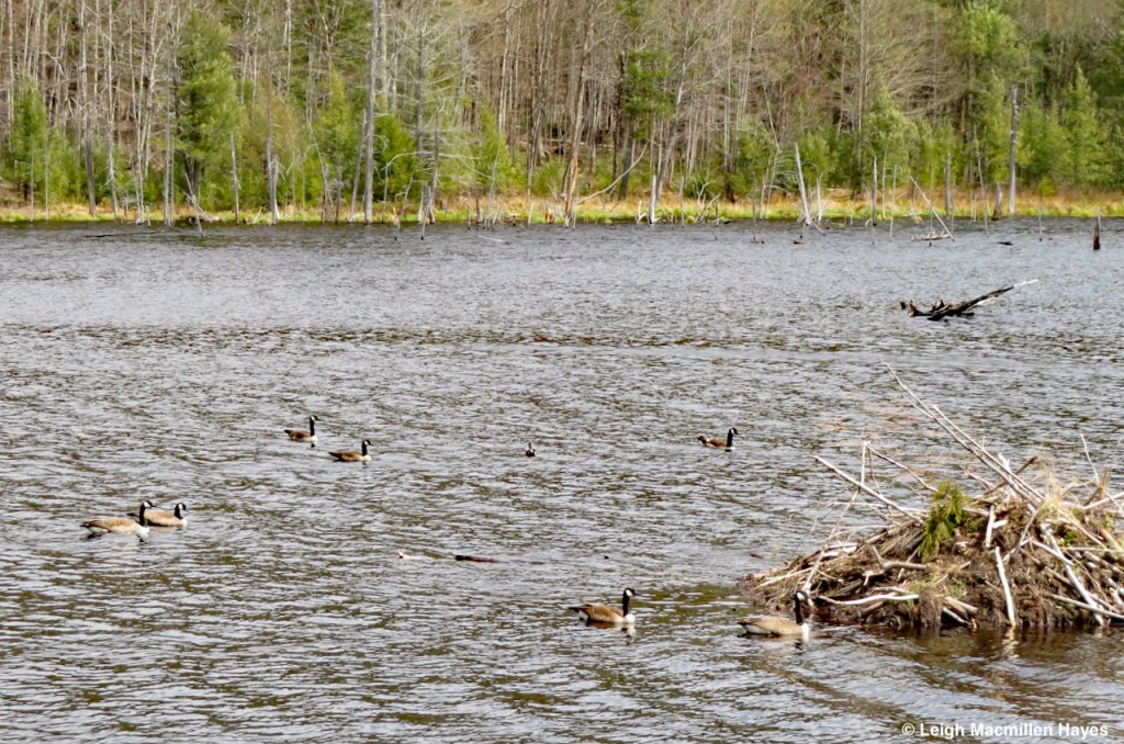 Sound effects: Wind in the trees, a certain Grackle with a regular rusty-gate note; turtles plopping into water; Canada geese honking like bullfrogs.