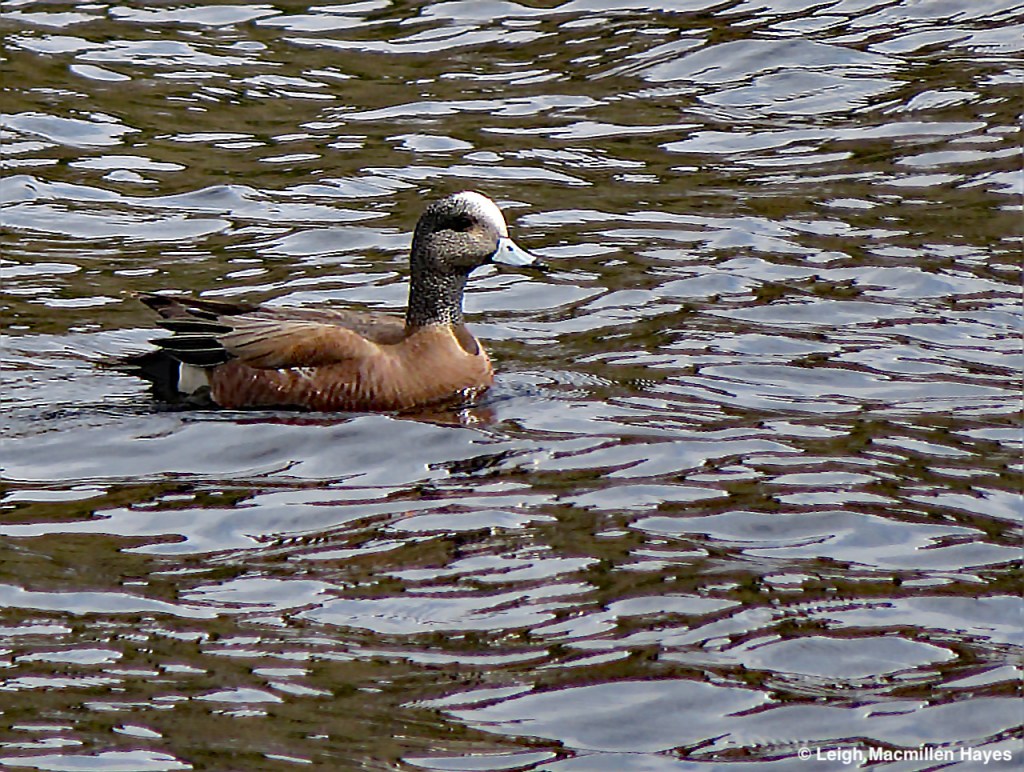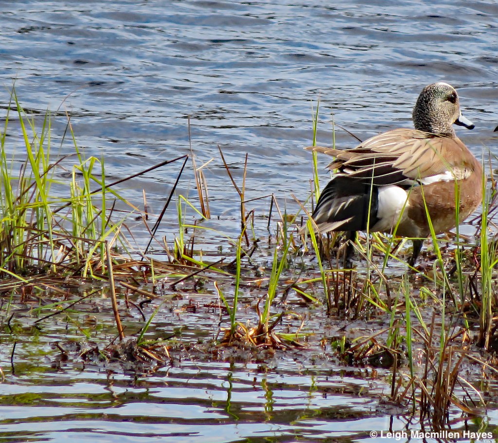 Main character: Female American Wigeon donning a warm brown body, grayish head with smudge around her eye, and pale bill tipped in black.