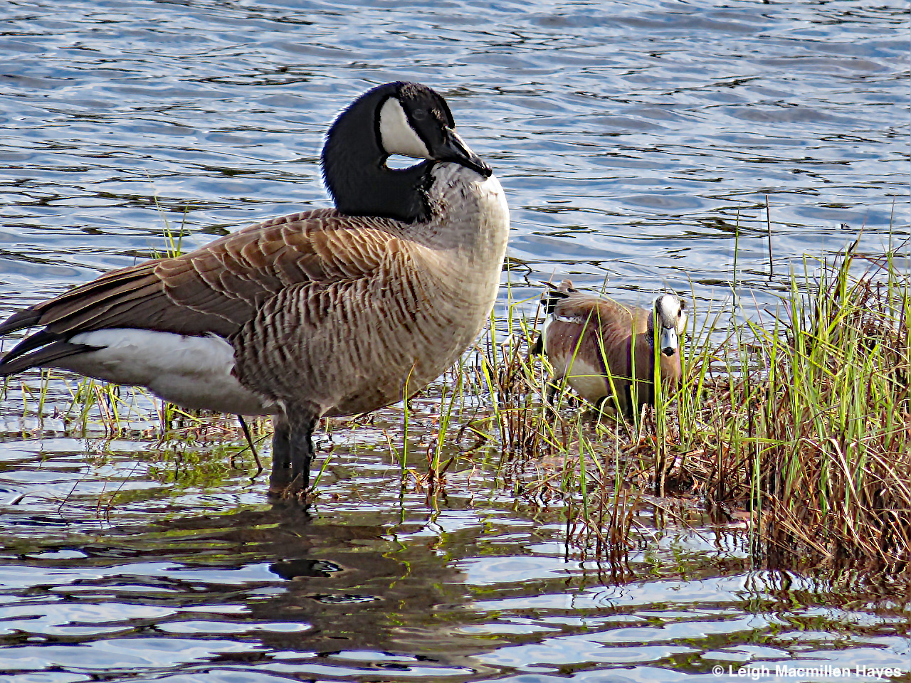 Cast: An American Wigeon located at twelve o’clock in the circle of Canada Geese.