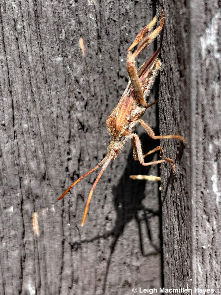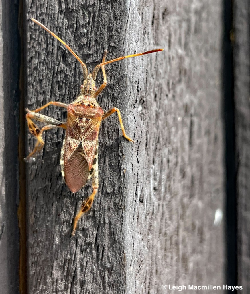 Cast: Western Conifer Seed Bug upon a wooden wildlife blind.