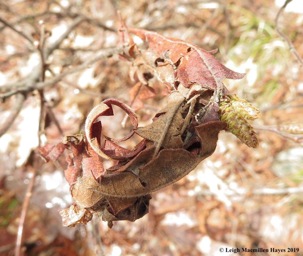 As I said, I’ve done a lot of scanning this week, including on a couple of solo trips, and it was on one of these that I made one of my favorite discoveries: a Caddisfly larvae. In larval form, Caddisflies are resourceful architects who repurpose their surroundings to create their homes. Sometimes I find them constructed of hemlock needles topped with a maple flowers, and a friend sent a photo today of one she found who had built its house of grains of sand. My find . . . in the pool that suddenly had Fairy Shrimp this year: a mobile home built of leaves. It was so well camouflaged that only the movement made me realize what was before my eyes.