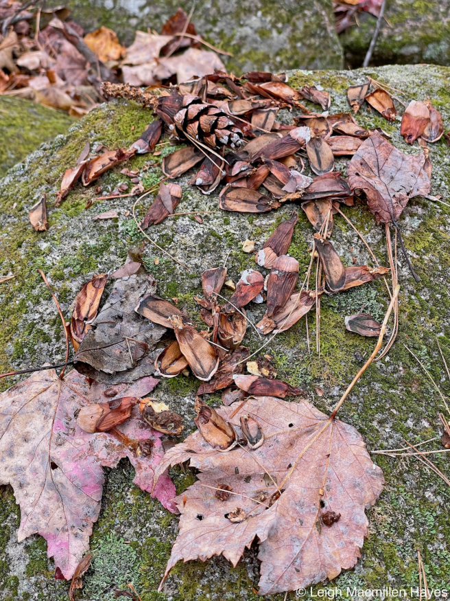 Turns out, I’m not the only one who knows to go about it–for Red Squirrels love to take each pine cone scale off in order to get to the seeds stored by such. Their method of descaling a cone is rather like us eating corn on the cob. I actually referenced both the pine cone painting and this one in Another Amazing Lesson from a Red Squirrel.