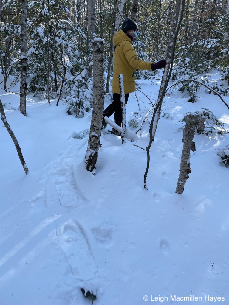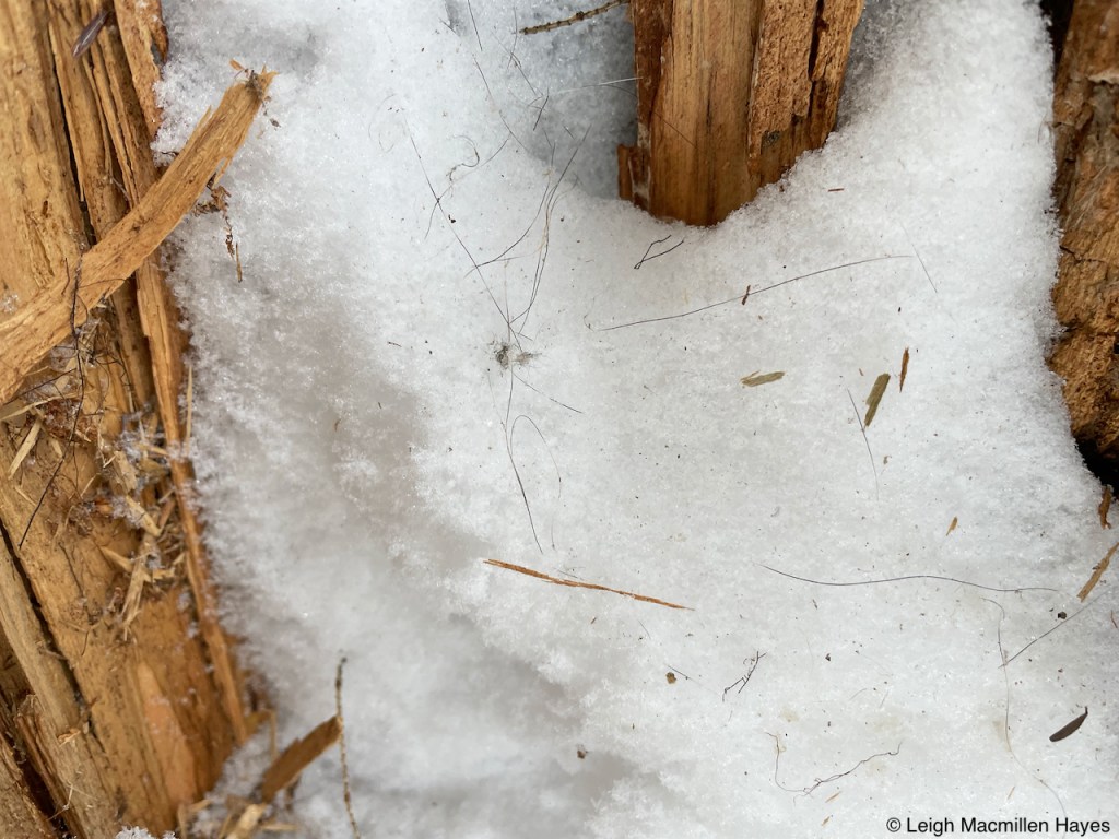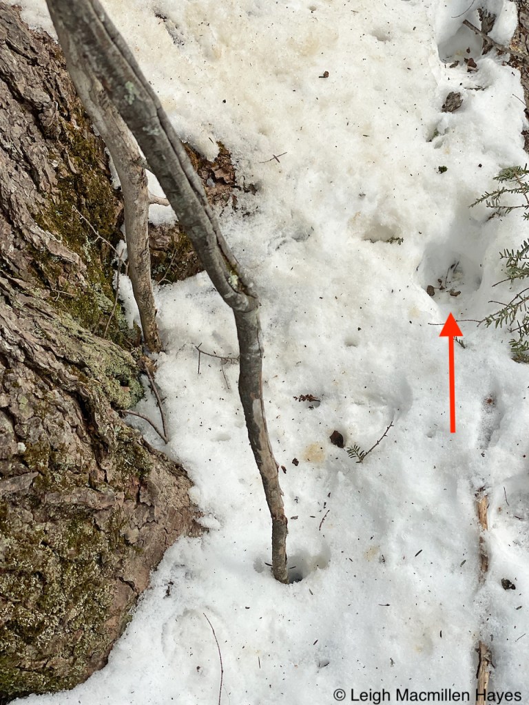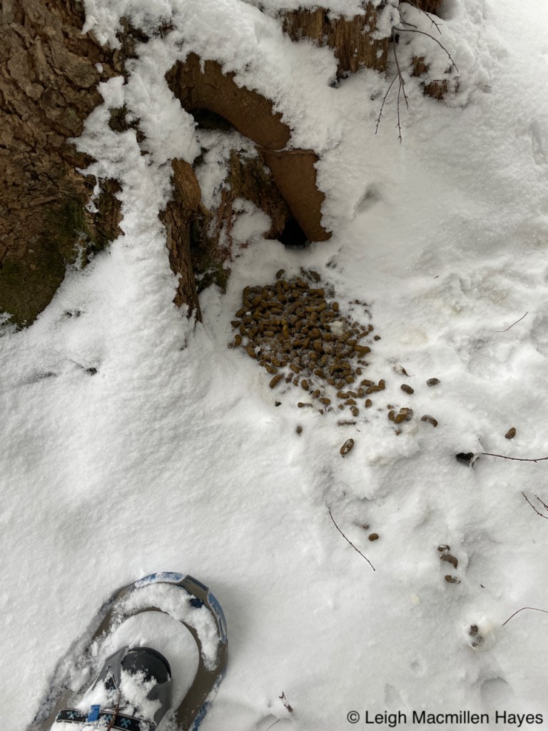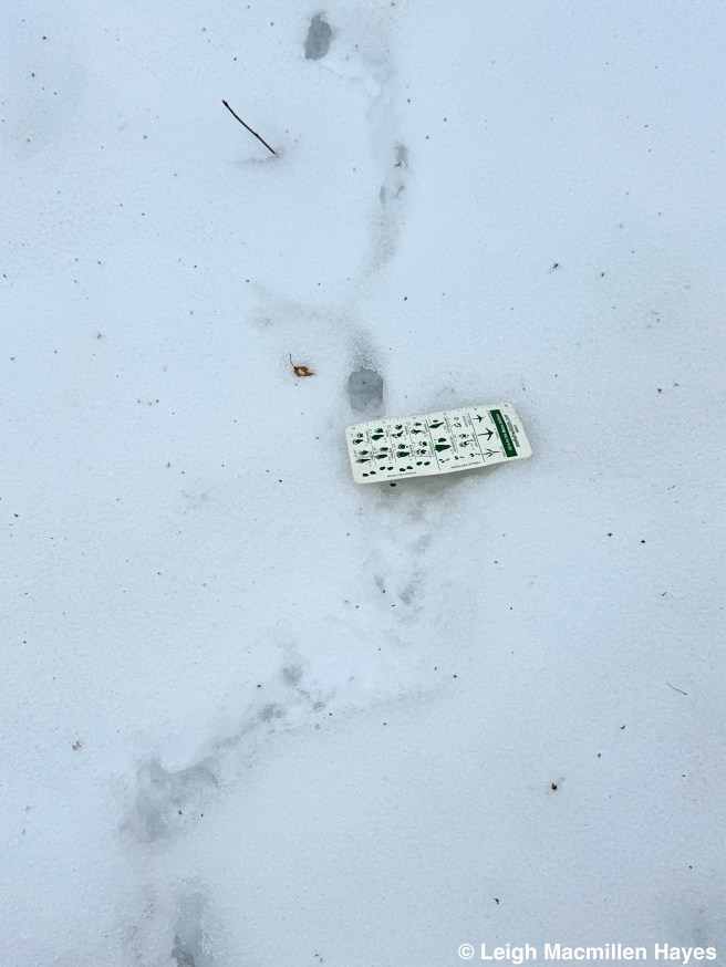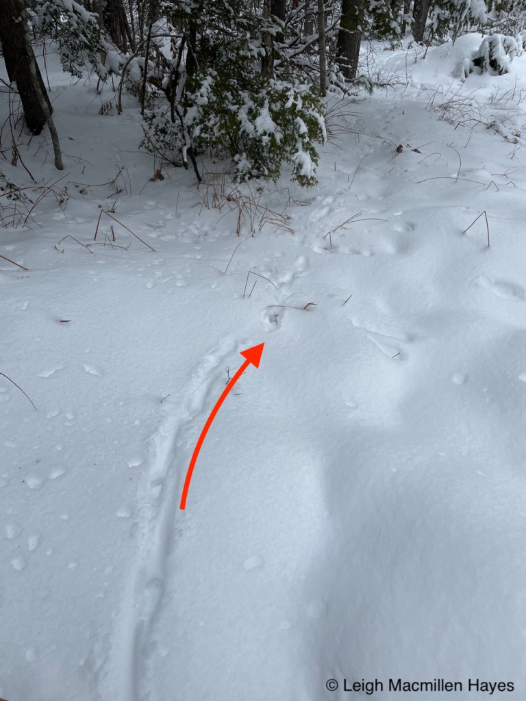 Eventually I moved on, and the next beauty to share a sign of its presence in these woods was a Snow Lobster, aka Snowshoe Hare. Remember, the two feet at the top of the photo are actually the hind feet, while the two behind, that form the lobster tail, are the front feet–as the hind feet swing around the front and land as this hopper leaps forward.
