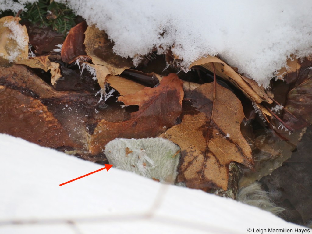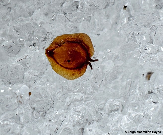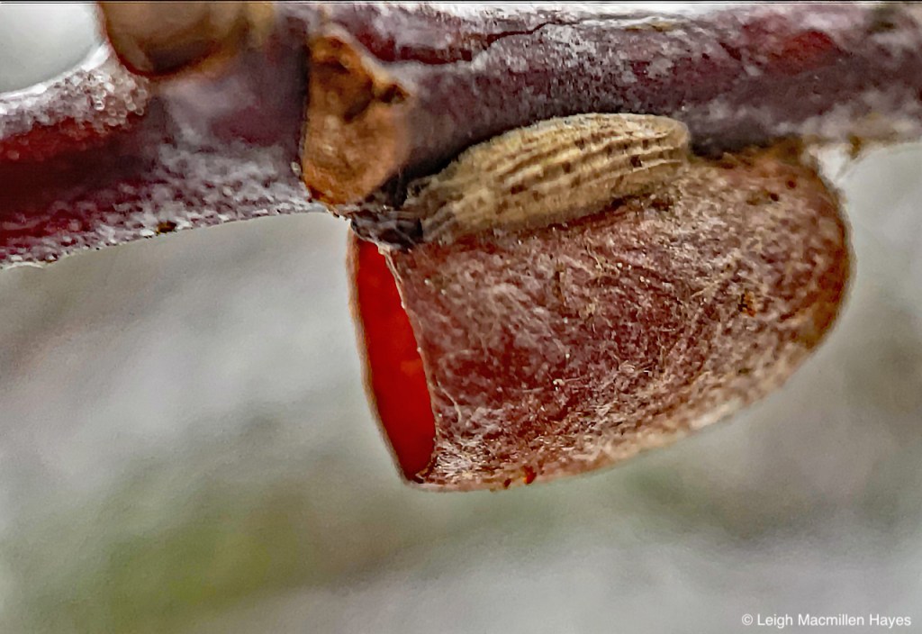 Witch hazel (Hamamelis virginiana) grows abundantly beside younger beech trees. Though the flowers are now past their peak, I found a couple of dried ribbony petals extending from the cup-shaped bracts. China cups? No, but in the winter setting, the bracts are as beautiful as any flower.