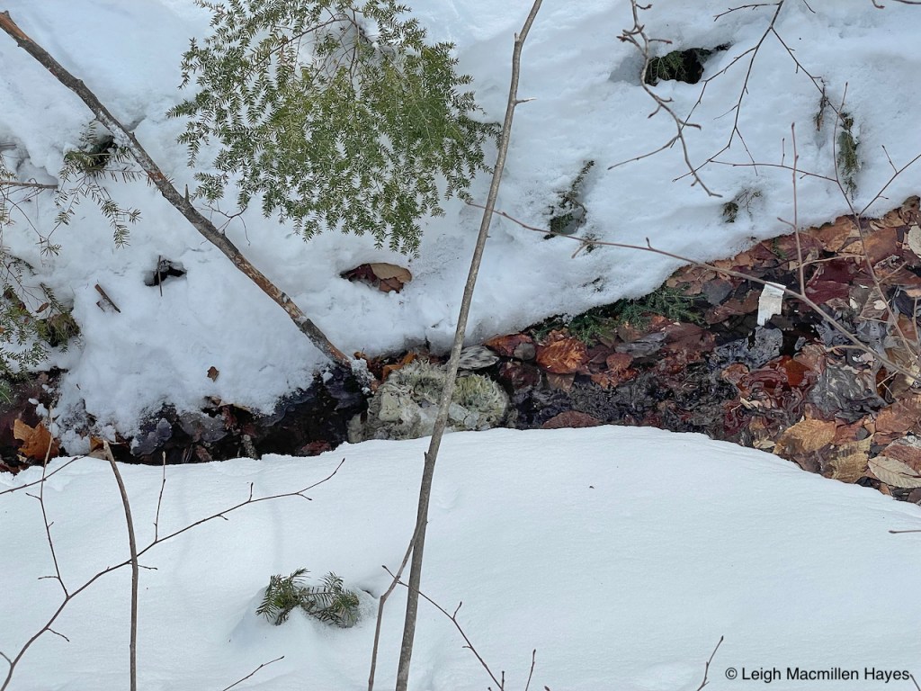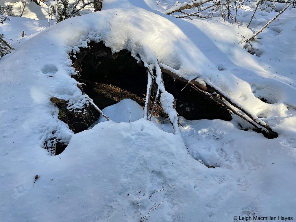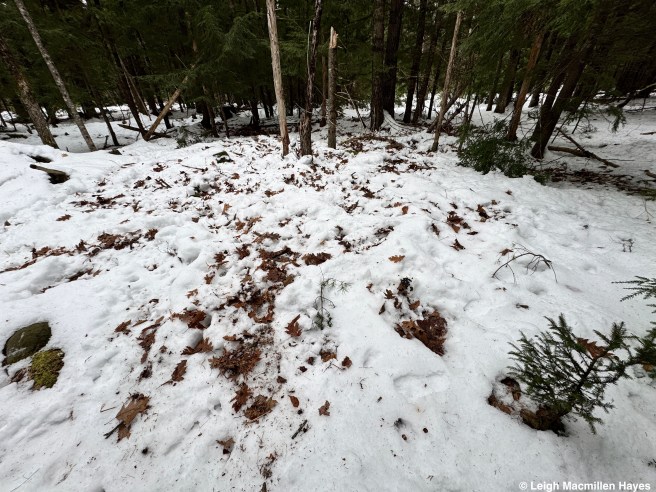 But it’s what I saw in the hollow under the stump, where another tree presumably served as a nursery and has since rotted away, that made me think about how this year’s lack of snow has affected wild life. In the center is ruffed grouse scat. Typically, ruffed grouse burrow into snow on a cold winter night. Snow acts as an insulator and hides the bird from predators. I found numerous coyote and bobcat tracks today. It seems that a bird made use of the stump as a hiding spot–though not for long or there would have been much more scat.