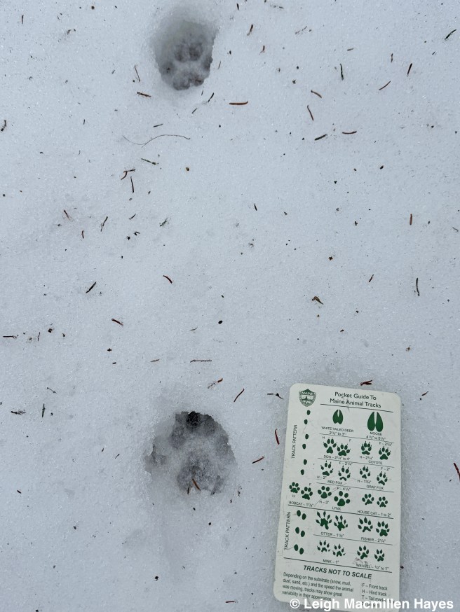 Because I was traveling light, I only had my Maine IF&W card in my pocket to offer a sense of size. But a closer look revealed that this particular trail included the Otter(s) moving in opposite directions, again at different times due to the clarity or non-clarity of the prints.