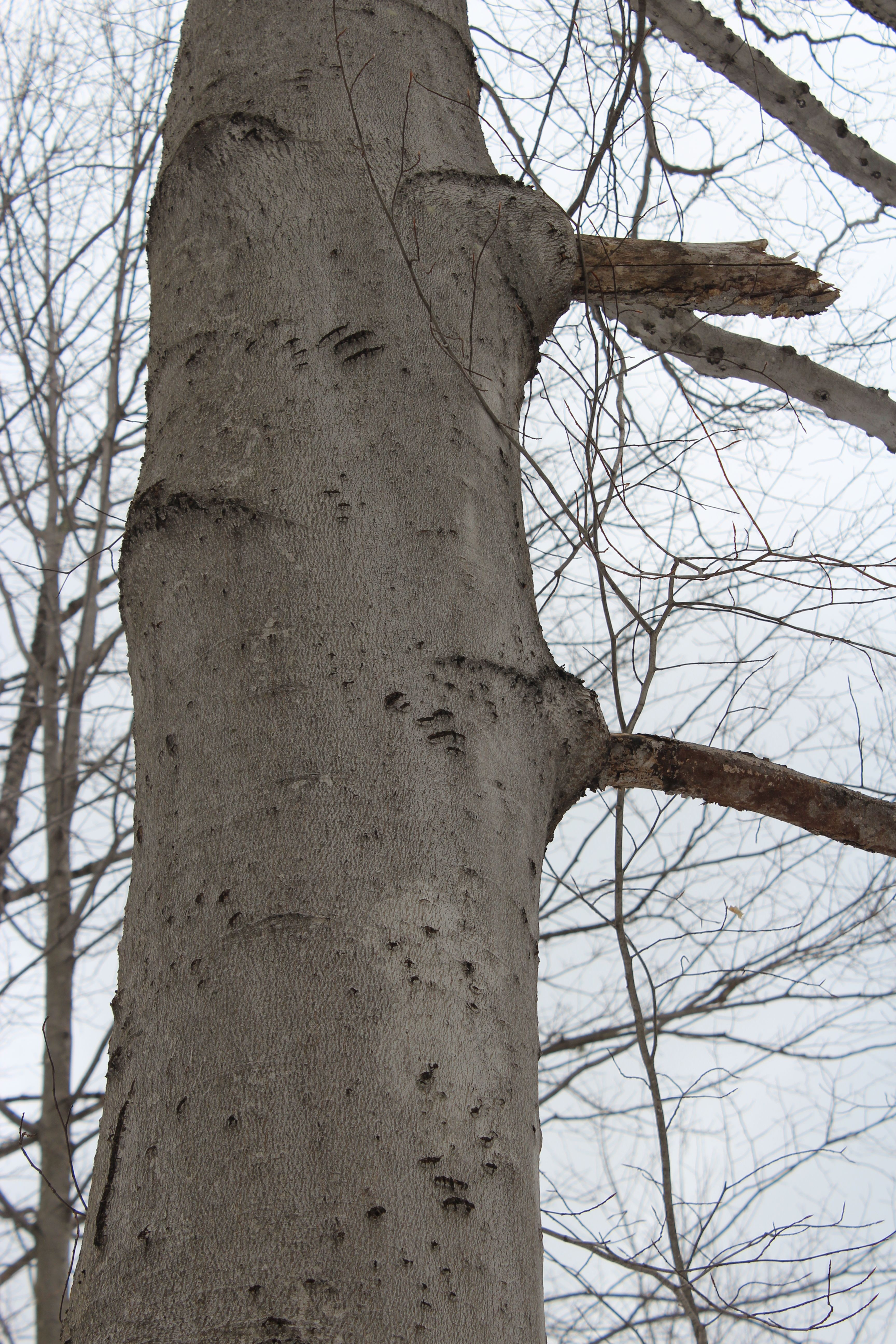 As I plodded along, my eyes were ever scanning and . . . I was treated to a surprise. Yes, a beech tree. Yes, it has been infected by the beech scale insect. And yes, a black bear has also paid a visit.
