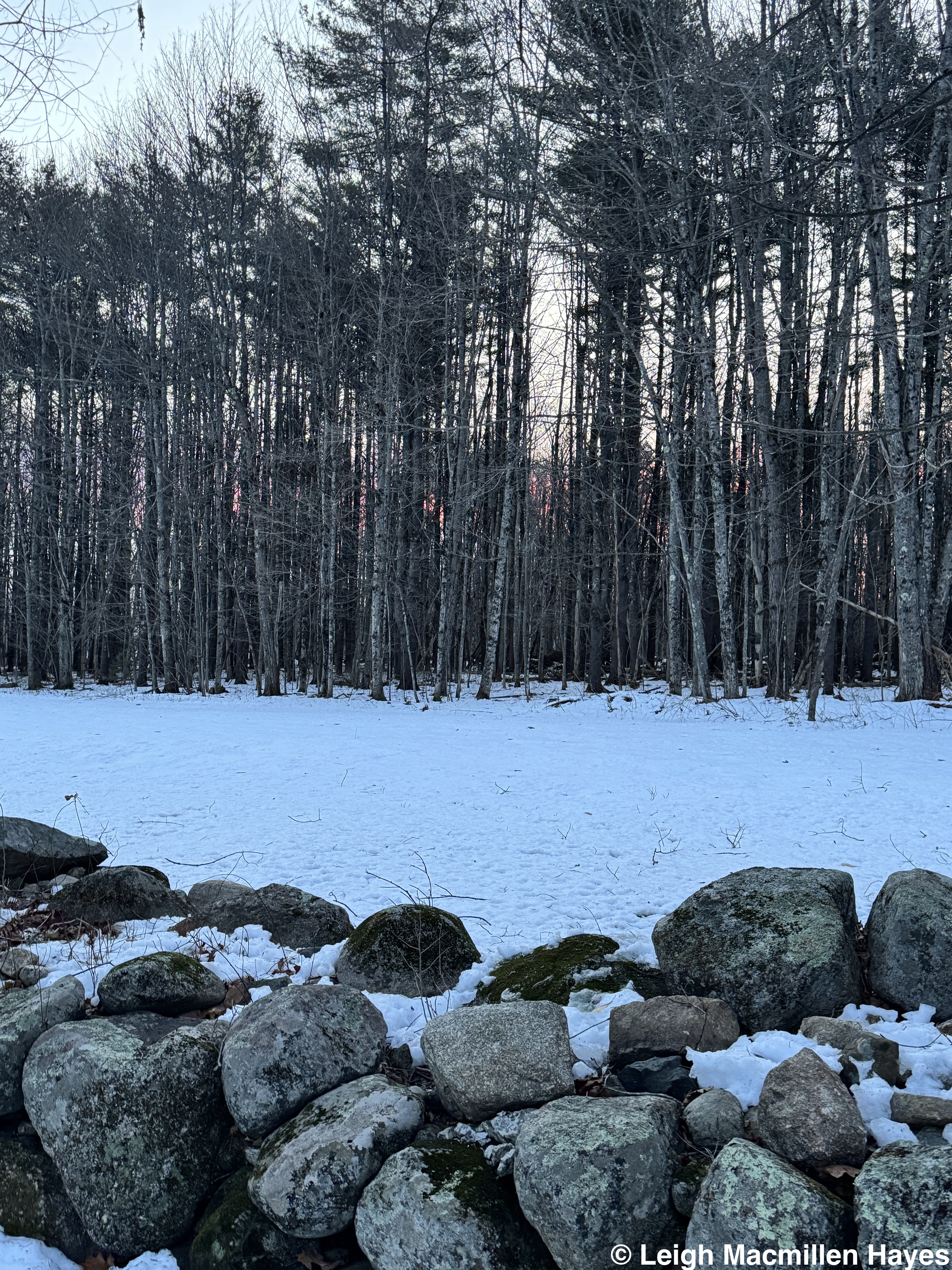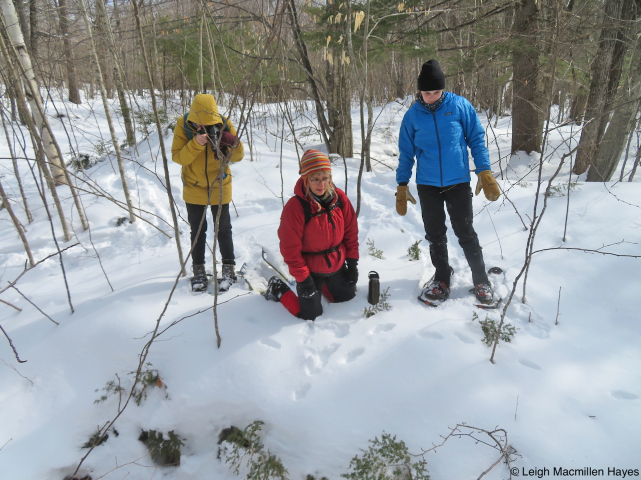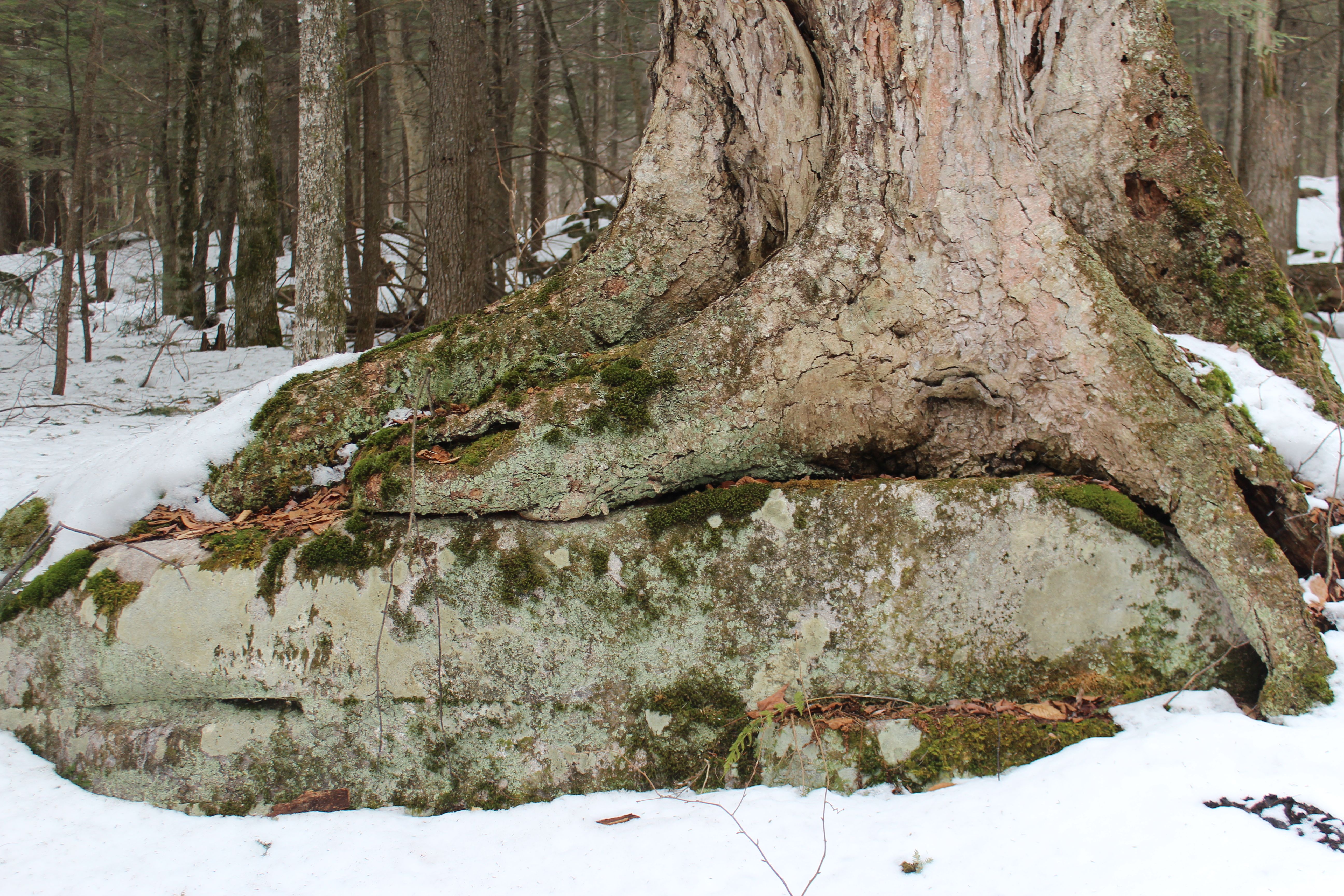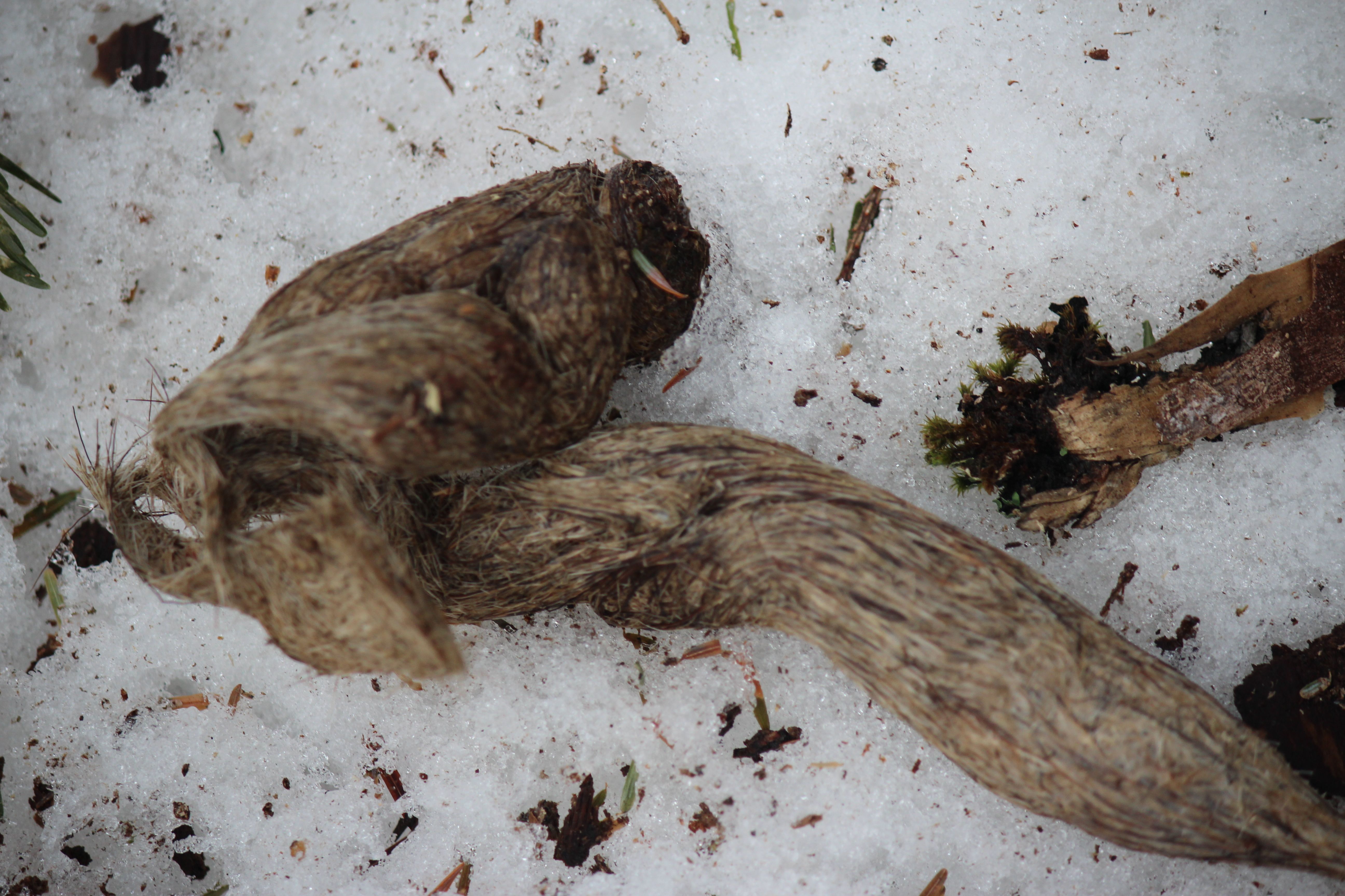 But it’s what I saw in the hollow under the stump, where another tree presumably served as a nursery and has since rotted away, that made me think about how this year’s lack of snow has affected wild life. In the center is ruffed grouse scat. Typically, ruffed grouse burrow into snow on a cold winter night. Snow acts as an insulator and hides the bird from predators. I found numerous coyote and bobcat tracks today. It seems that a bird made use of the stump as a hiding spot–though not for long or there would have been much more scat.