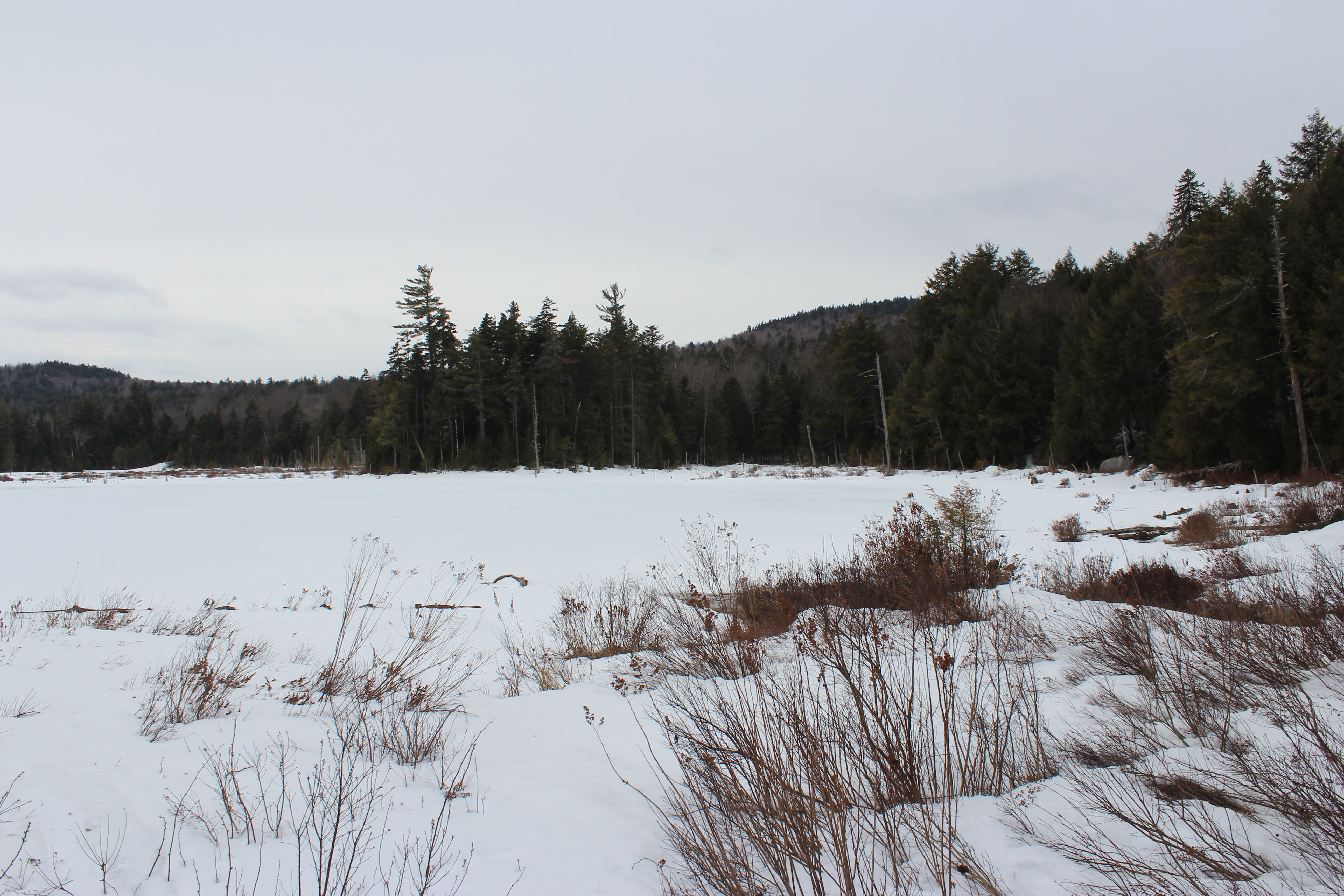 With the Balds in Evans Notch forming the backdrop, the brook is home to numerous beaver lodges, including these two.