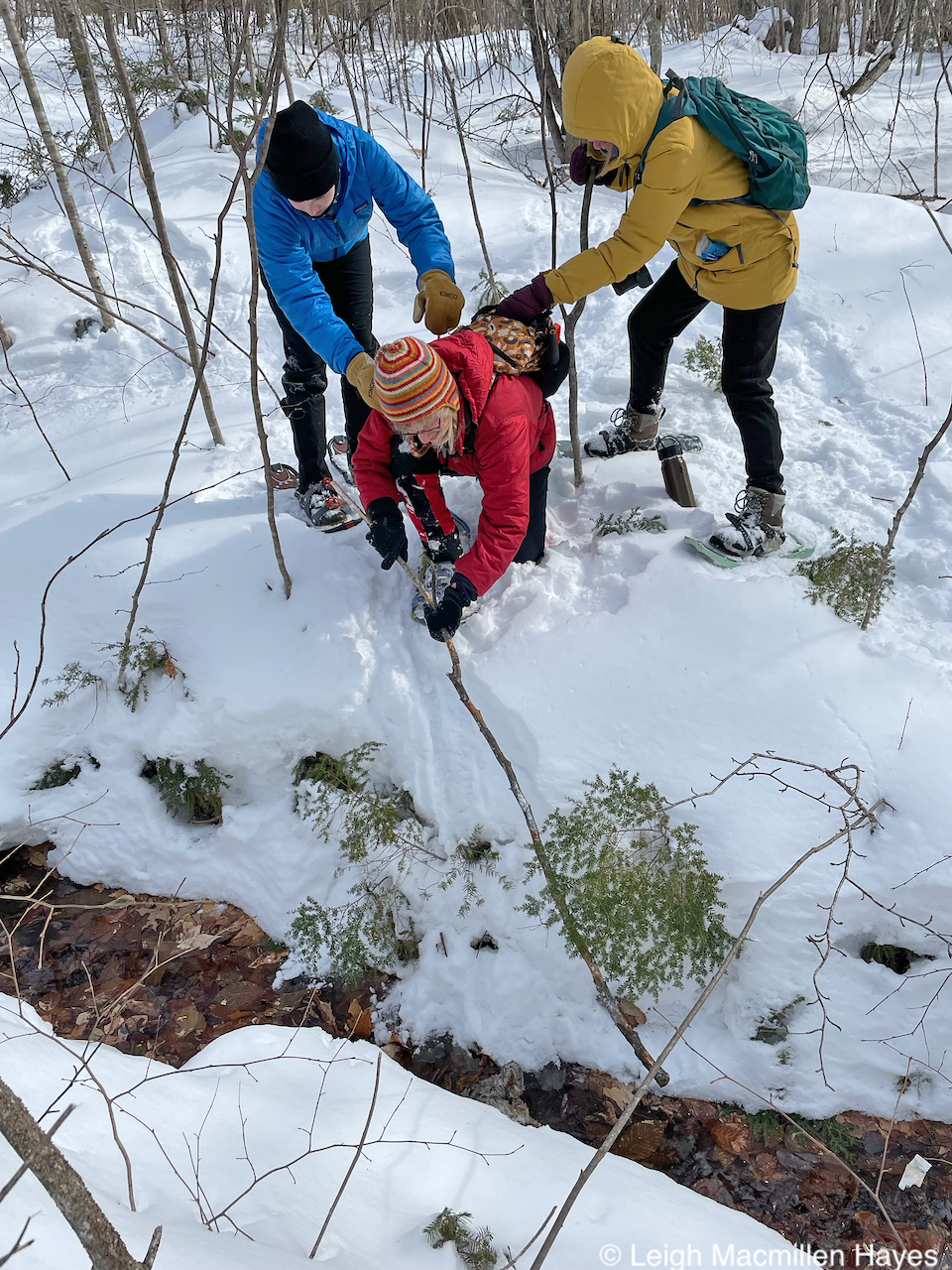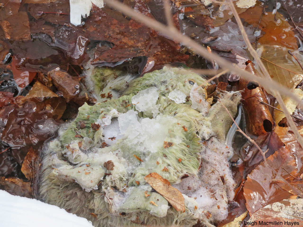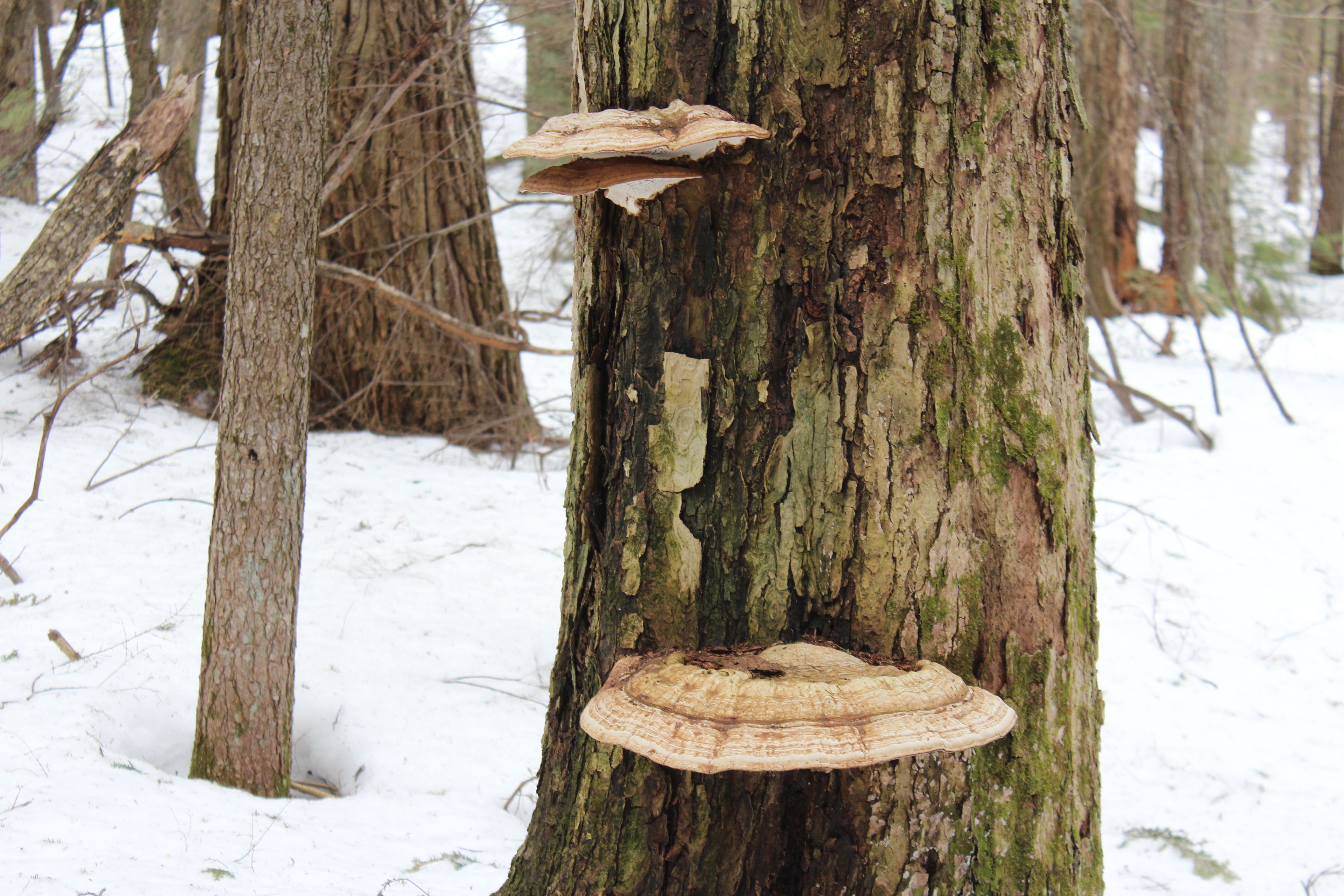 In the meantime, it’s still winter and this hemlock stump with a display of old hemlock varnish shelf (Ganoderma tsugae) caught my eye. By now, I was on the green trail.