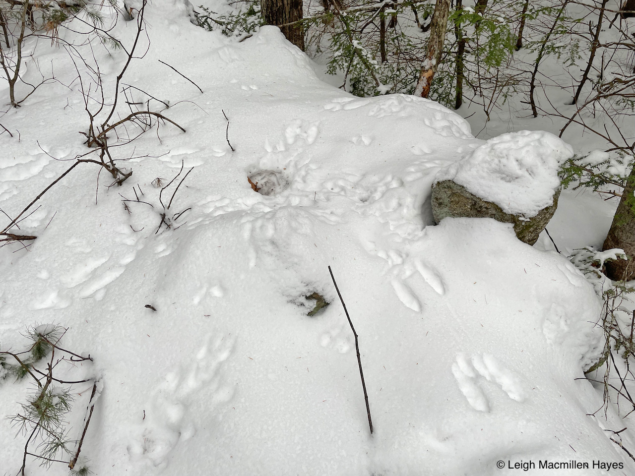 I didn’t venture off trail to locate Porky’s den, but I knew it was among the boulders just beyond where I stood for I could see its tracks moving back and forth between them and suspect there is more than one home site in this locale.