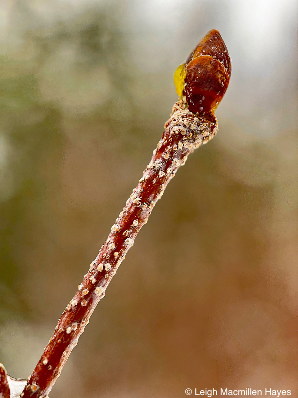 Witch hazel (Hamamelis virginiana) grows abundantly beside younger beech trees. Though the flowers are now past their peak, I found a couple of dried ribbony petals extending from the cup-shaped bracts. China cups? No, but in the winter setting, the bracts are as beautiful as any flower.