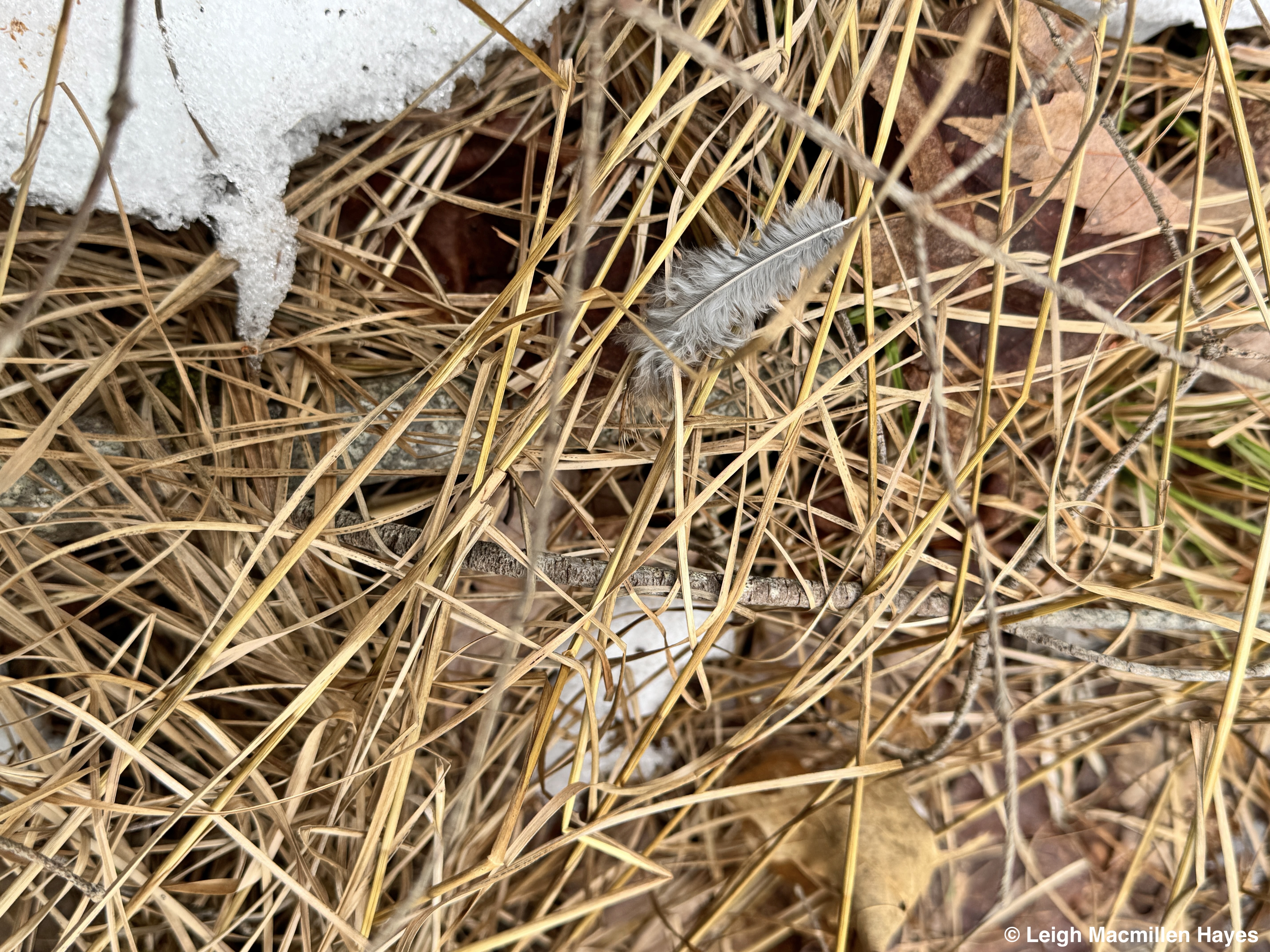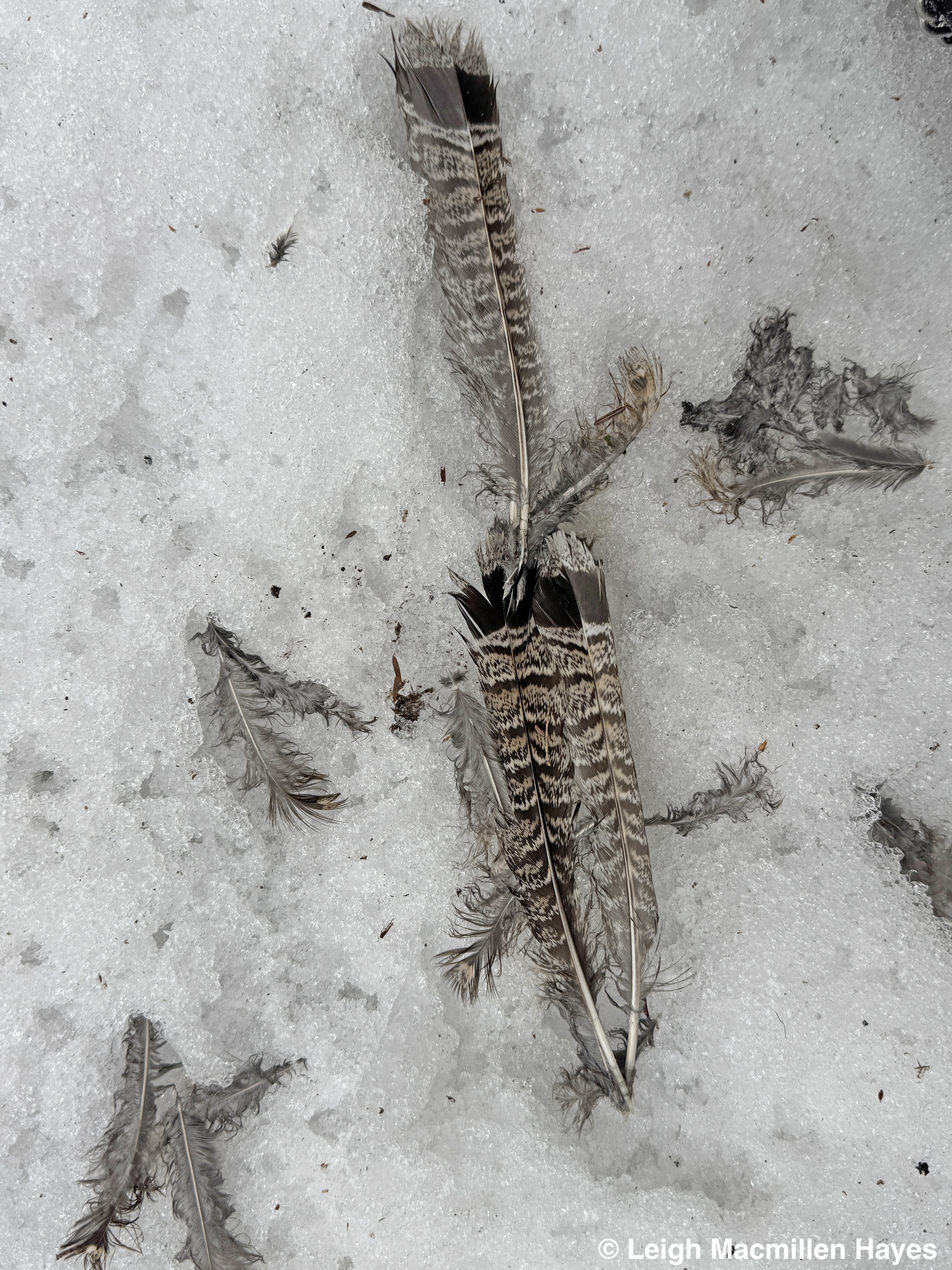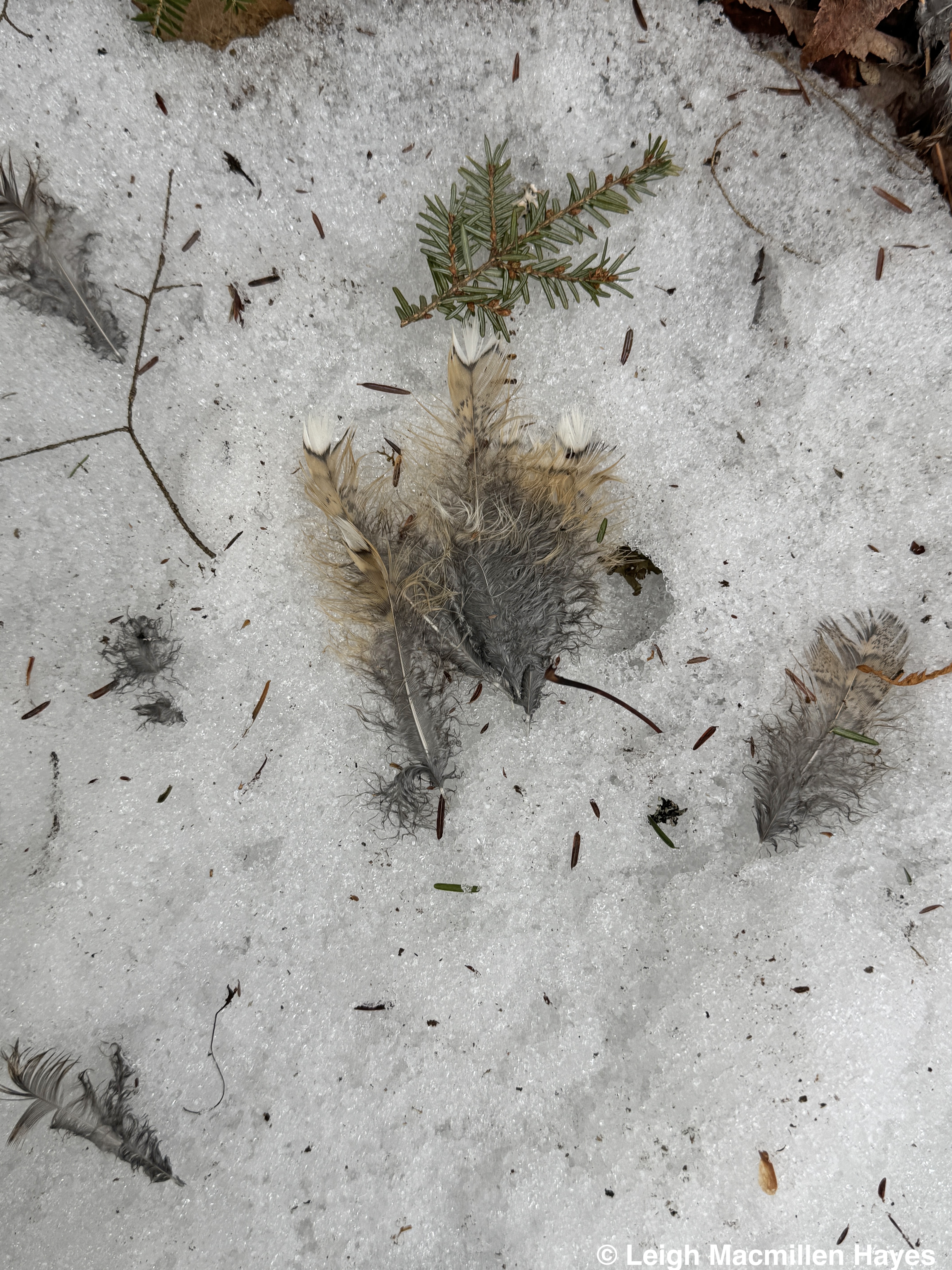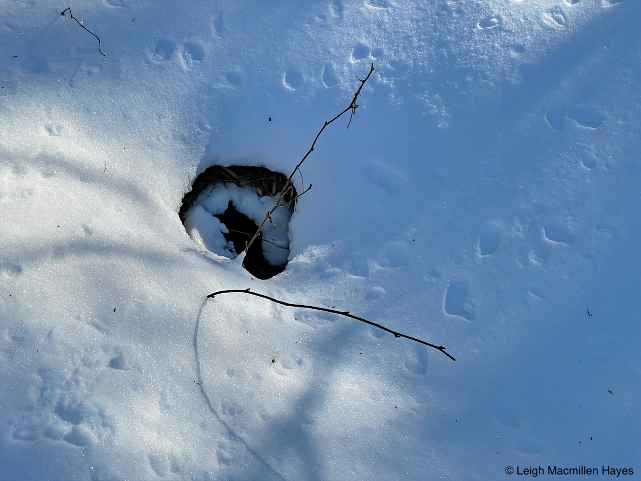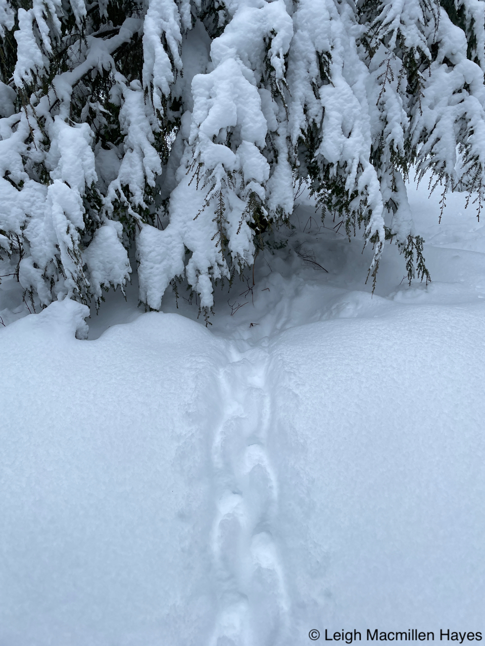 Eventually I moved on, and the next beauty to share a sign of its presence in these woods was a Snow Lobster, aka Snowshoe Hare. Remember, the two feet at the top of the photo are actually the hind feet, while the two behind, that form the lobster tail, are the front feet–as the hind feet swing around the front and land as this hopper leaps forward.