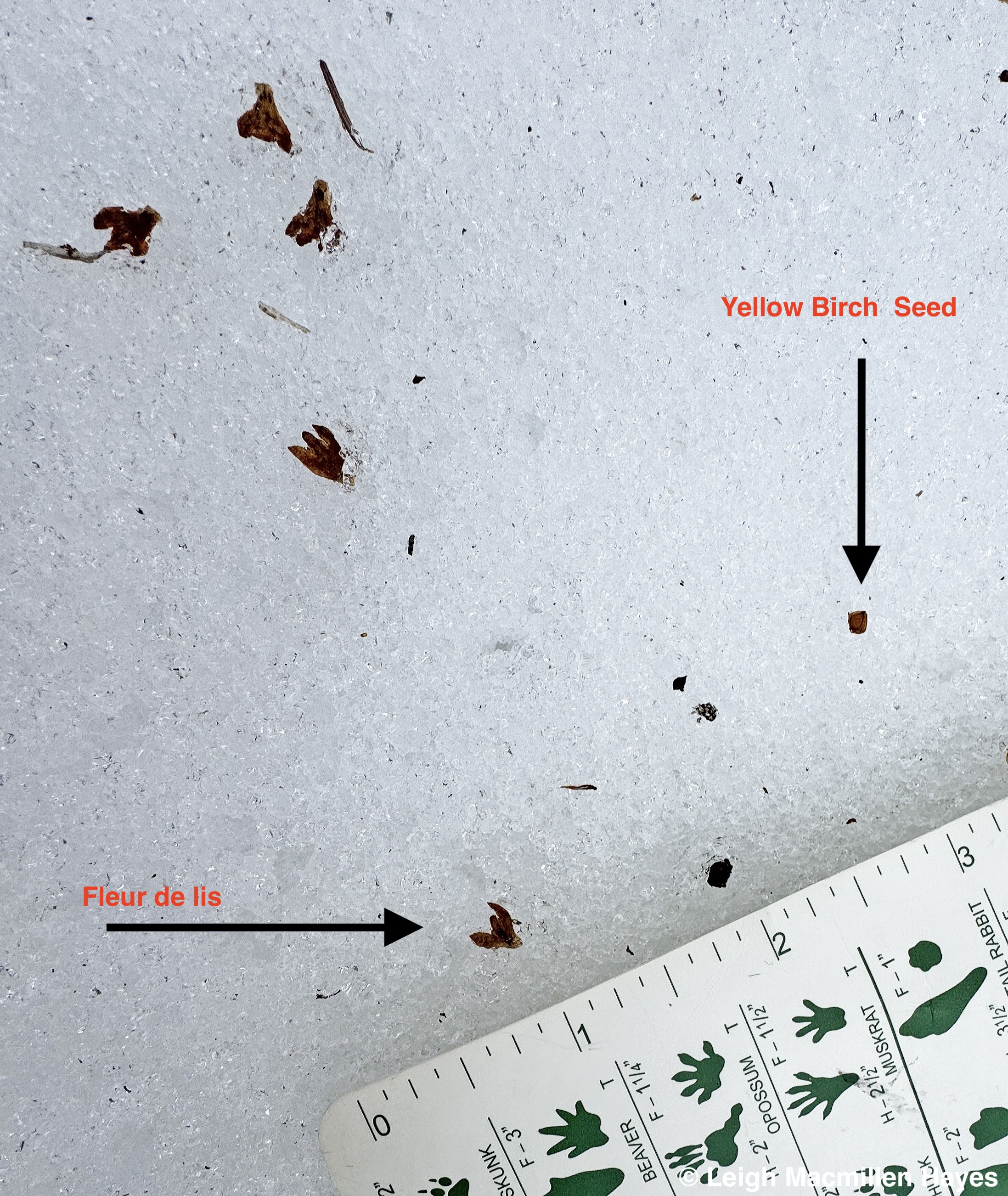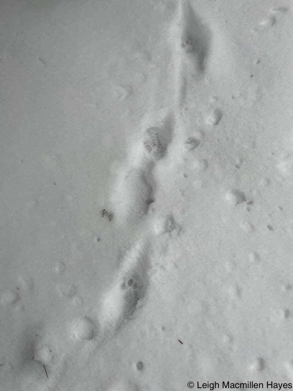 The best find in this spot–red squirrel prints. A few things to notice–the smaller feet that appear at the bottom of the print are the front feet–often off-kilter. Squirrels are bounders and so as the front feet touch down and lift off the back feet follow and land before the front feet in a parallel presentation. In a way, the entire print looks like two exclamation points.