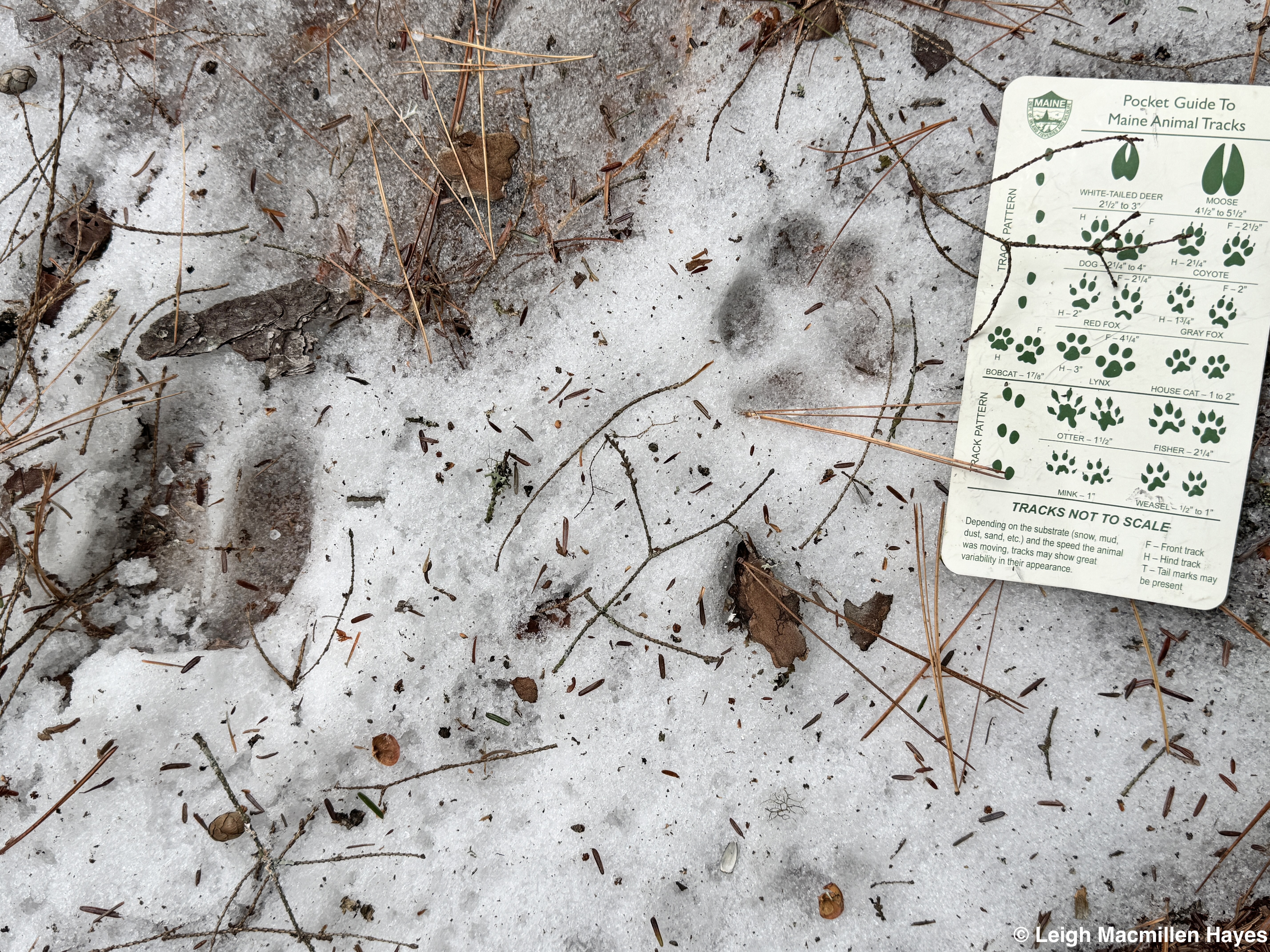 Because I was traveling light, I only had my Maine IF&W card in my pocket to offer a sense of size. But a closer look revealed that this particular trail included the Otter(s) moving in opposite directions, again at different times due to the clarity or non-clarity of the prints.