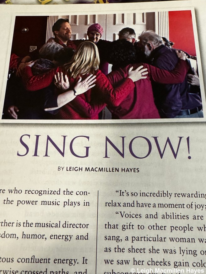 For the Winter 2013 issue, I wrote about a soul-filled choir–an a cappella group of women and men who sing for the terminally ill or those on the threshold between life and death, and their families. What was so special about that interview was that they invited me to sit in the center of their group. “I closed my eyes and suddenly I was surrounded with a cadence of voices in three part harmony singing ‘River of Jordan.’ I felt as if I was softly embraced by a warm blanket.” The memory still warms my heart.