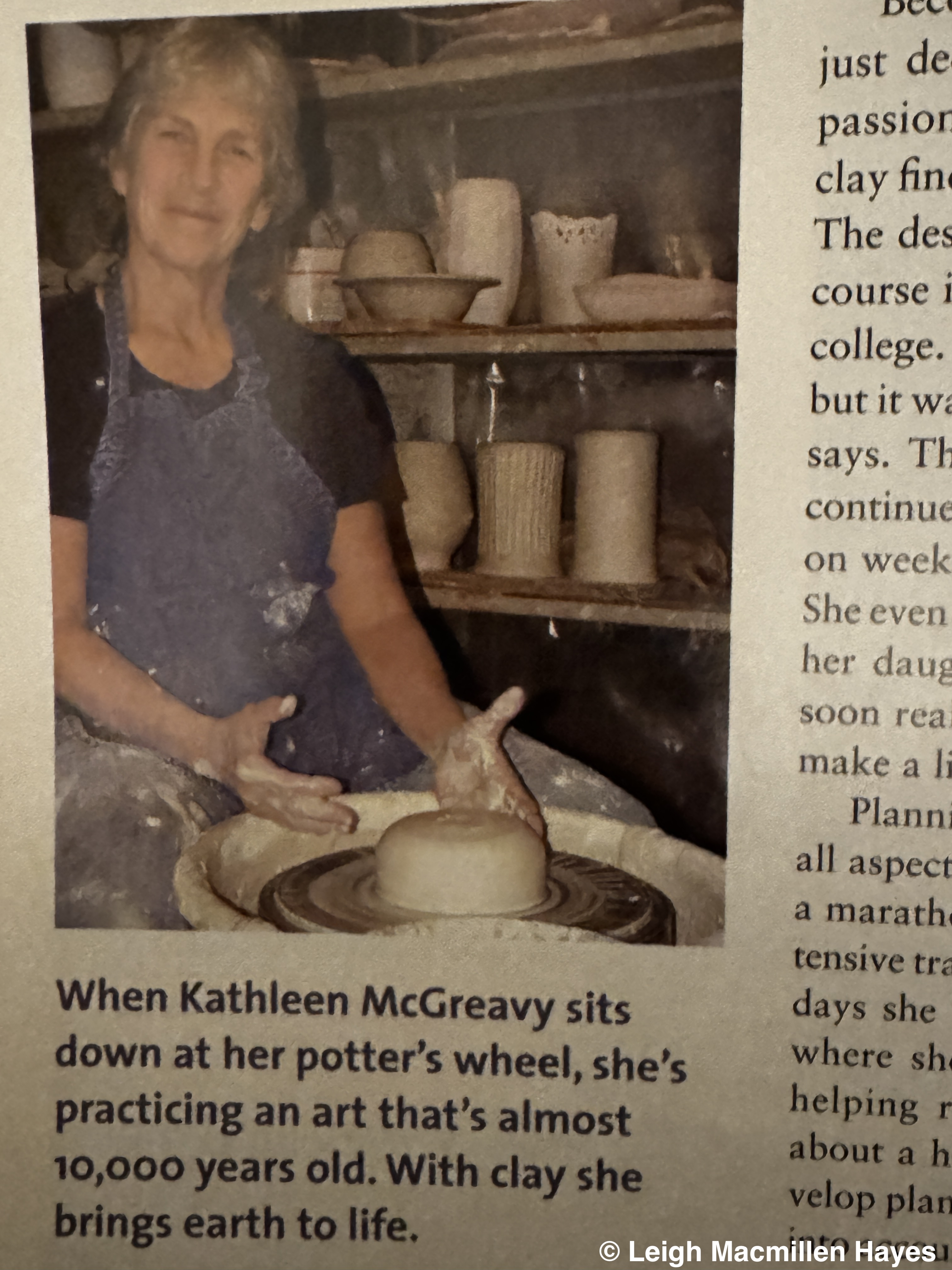 One was entitled “Bringing Earth to Life,” about Kathleen (Kathy) McGreavy, a potter from Brownfield we featured in Spring 2010. There were two memorable things about researching and writing that article: 1) Kathy let me throw a pot on the wheel, which she later finished, glazed, and gave to me.