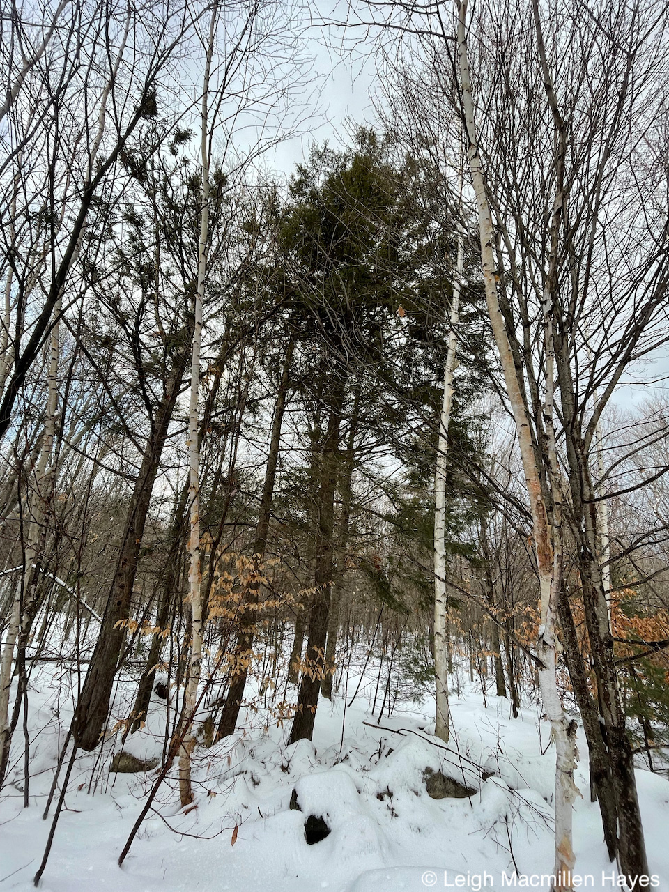 Dedication: For my dear friend Faith on her birthday, especially since she once scanned photos of the very same trees at HRF in another blog I’d posted that included a porcupine, and struggled to see its form until I supplied close-ups. Happy Birthday, Faith!