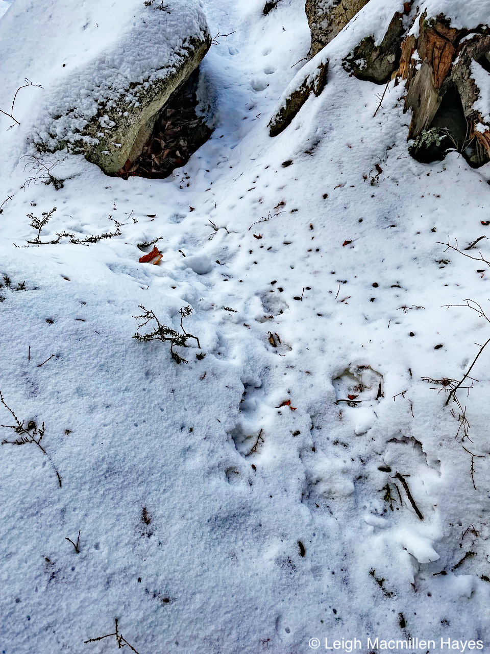 And under the tree–a display of tracks and scat all not completely covered by the snow that fell earlier in the day.