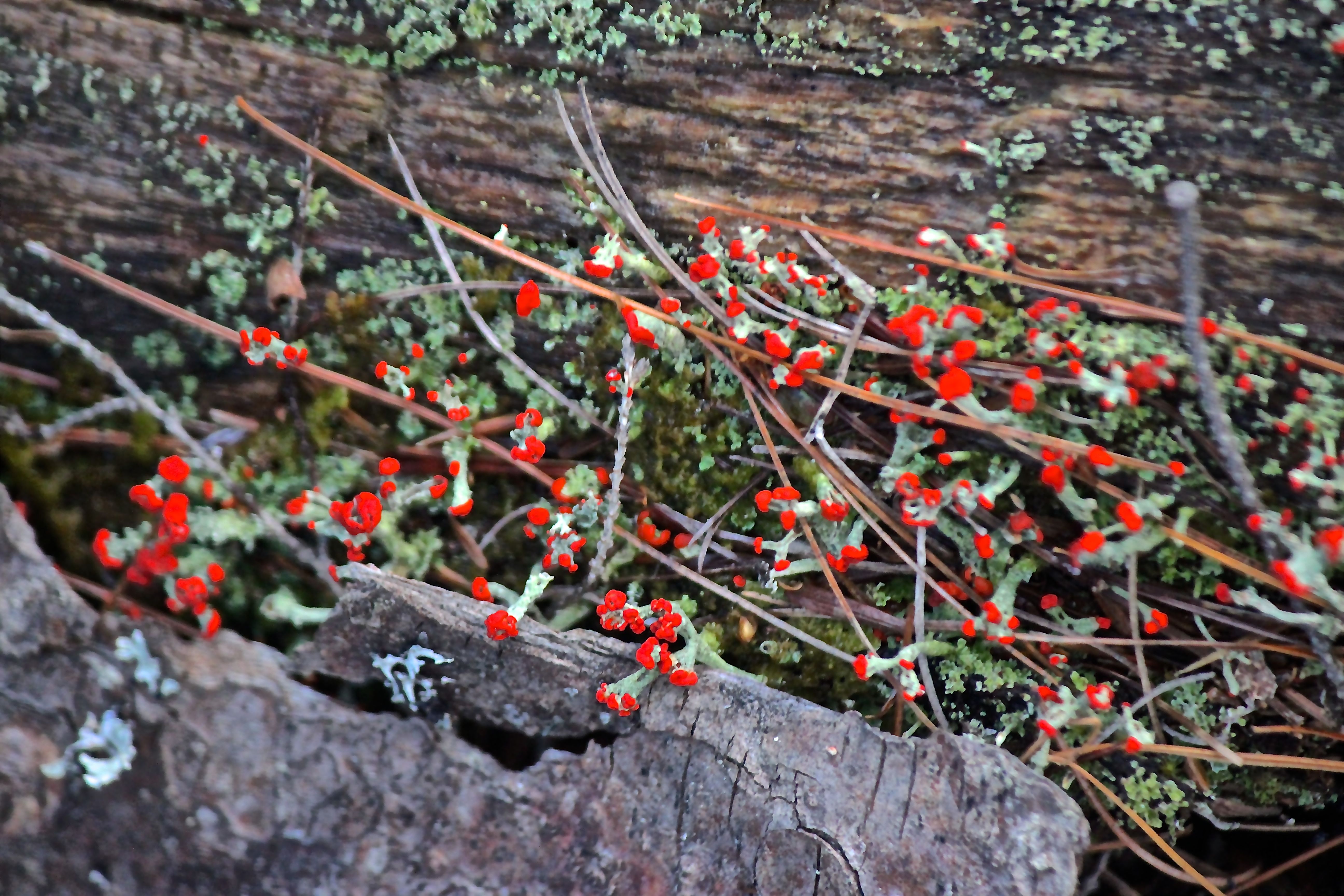 We are not ones to resist a more familiar friend, and so British Soldiers (Cladonia cristatella) also captured our focus. Despite their diminutive size, those bright crimson caps shouted for recognition.