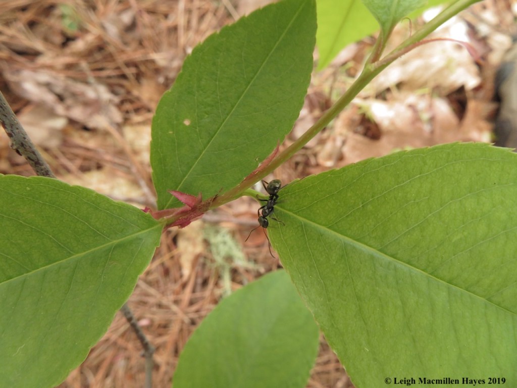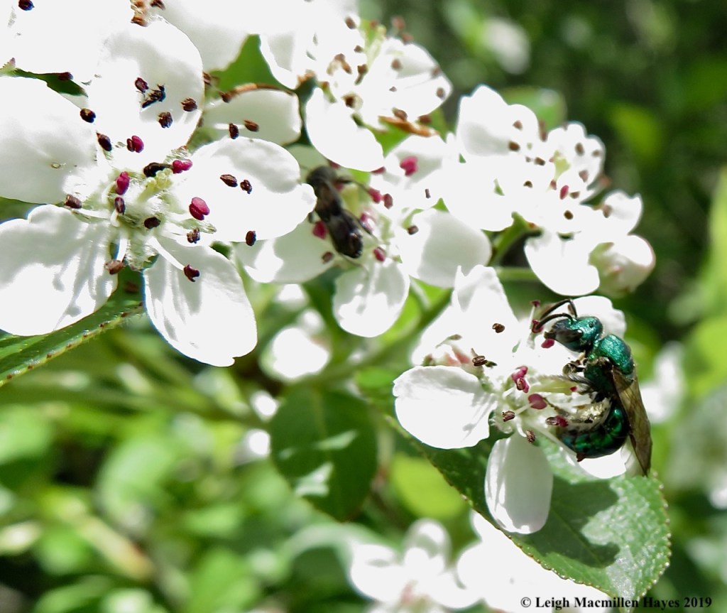 As I continued to admire them, there were others to note as well, like the metallic green Orchid Sweat Bee pollinating the Black Chokeberry flowers.