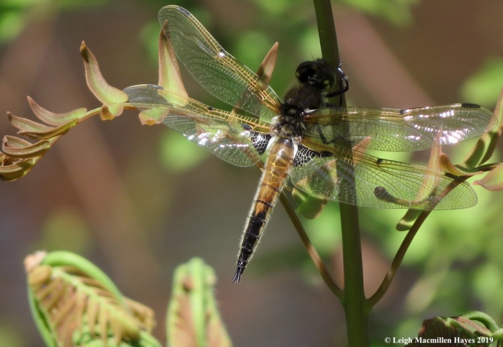 Again, shadows blocked the face of this species, but the wings and abdomen were far more worthy of attention as it clung to a Royal Fern. In fact, with so much gold, I felt like I was greeting a noble one. The Four-spotted Skimmer is actually quite small, yet stocky. The four spots refer to the black nodus and stigma (Huh? nodus: located midway between the leading edge of each wing where there is a shallow notch; stigma: located toward the wingtips). But notice also that the amber bar at the base of its wings and black basal patch on the hind wings–giving it an almost stained glass look.