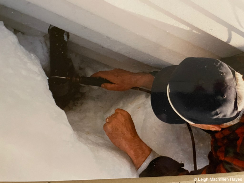 January 15: With the advent of a full moon, we knew more trouble was brewing as the temperature dropped. Pipes froze in our pantry sink. We placed the Kerosun heater by it and I kept pouring boiling water (thank goodness for a gas stove so we could cook on top, using a match to light the burners), into the sinks–to no avail. At 9:30am, Mr. Mush came over with a torch and warmed the pipes (at that time located literally outside the pantry).