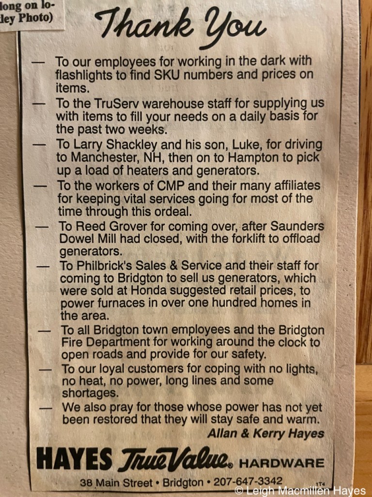 Via battery operated radio, CMP (Central Maine Power) officials warned customers not to talk to power people–just let them do their work as they’re under a tremendous amount of pressure. And definitely no bribing them with food.