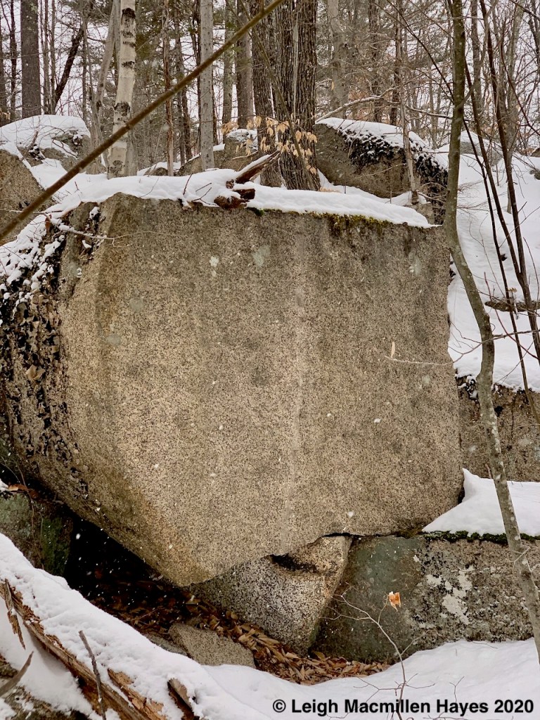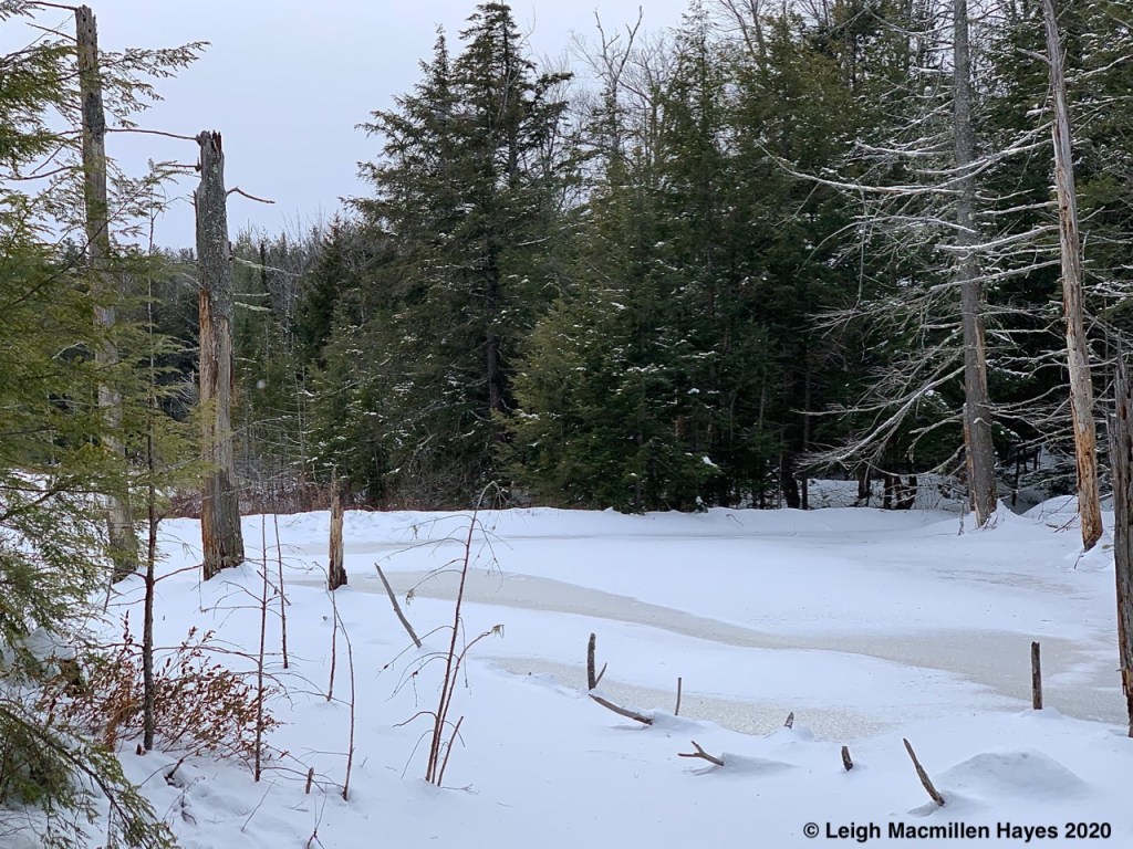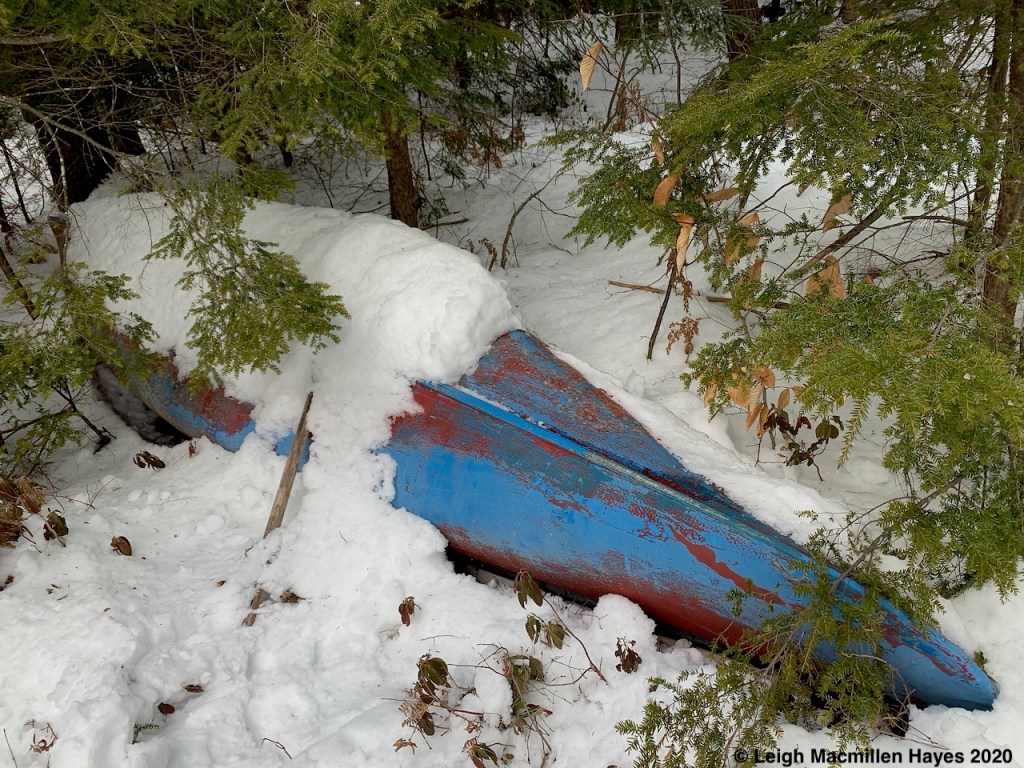 Was it the canoe half hidden in the snow? That surely was fun to stumble upon and reminded us both of canoes at LEA’s Holt Pond in Bridgton. This looked like another case of bring your own PFD and paddles. You might throw in some duck tape, just in case. But, no, it wasn’t the canoe.