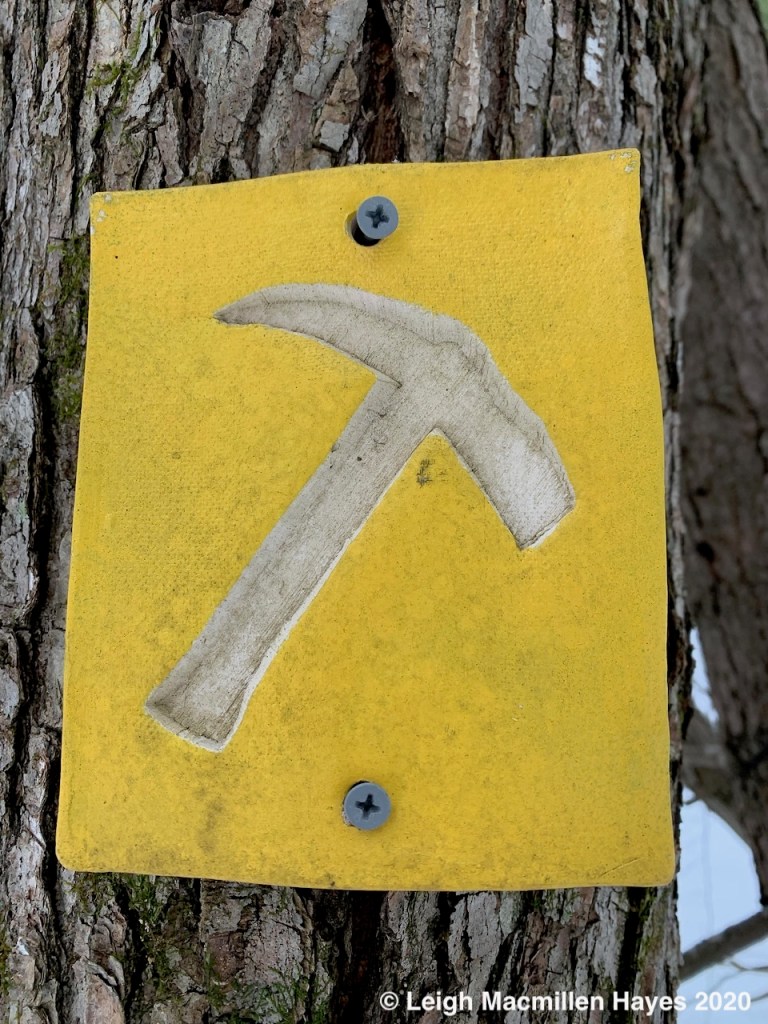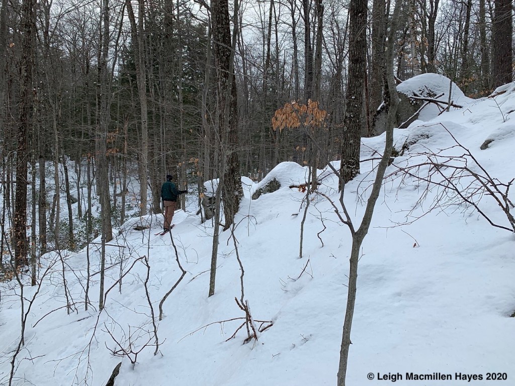 No blaze led diagonally behind us, but down through the trees my guy spied some yellow paint and so he checked it out before beckoning me to join him.