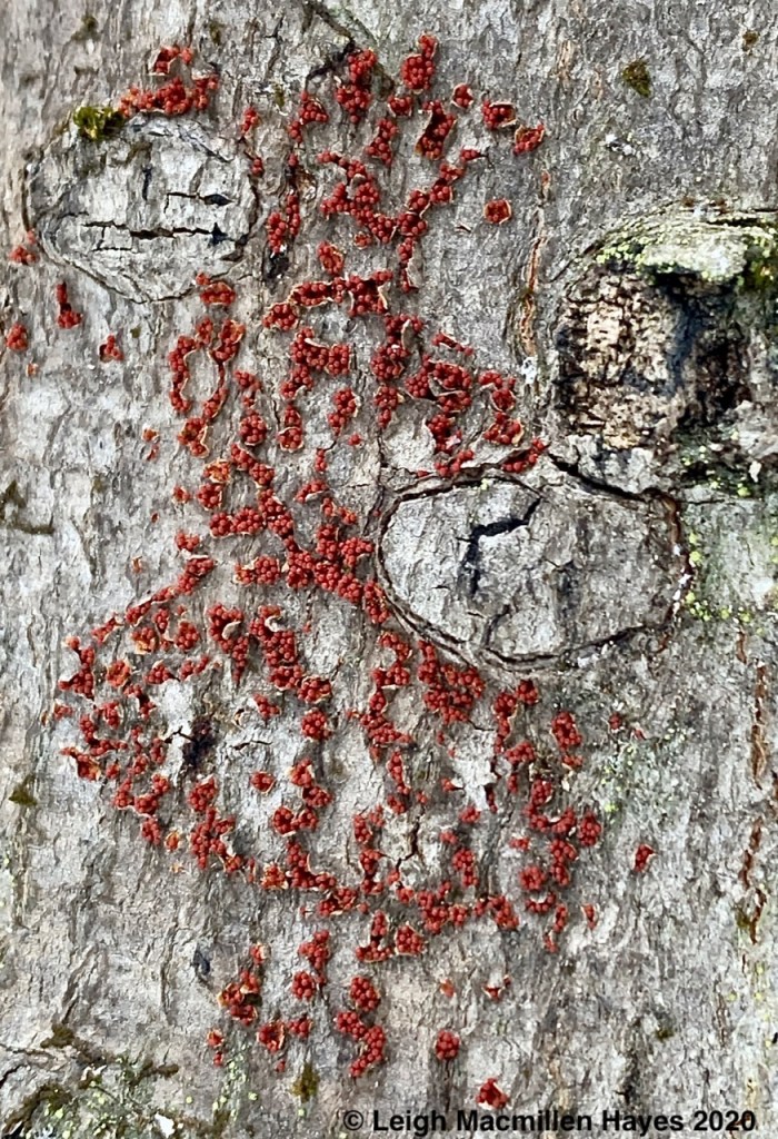And those red spots, as pretty as they appear, are actually tarry spots which ooze out of the cracks in the bark caused by the canker. Essentially, it appeared the tree was bleeding.