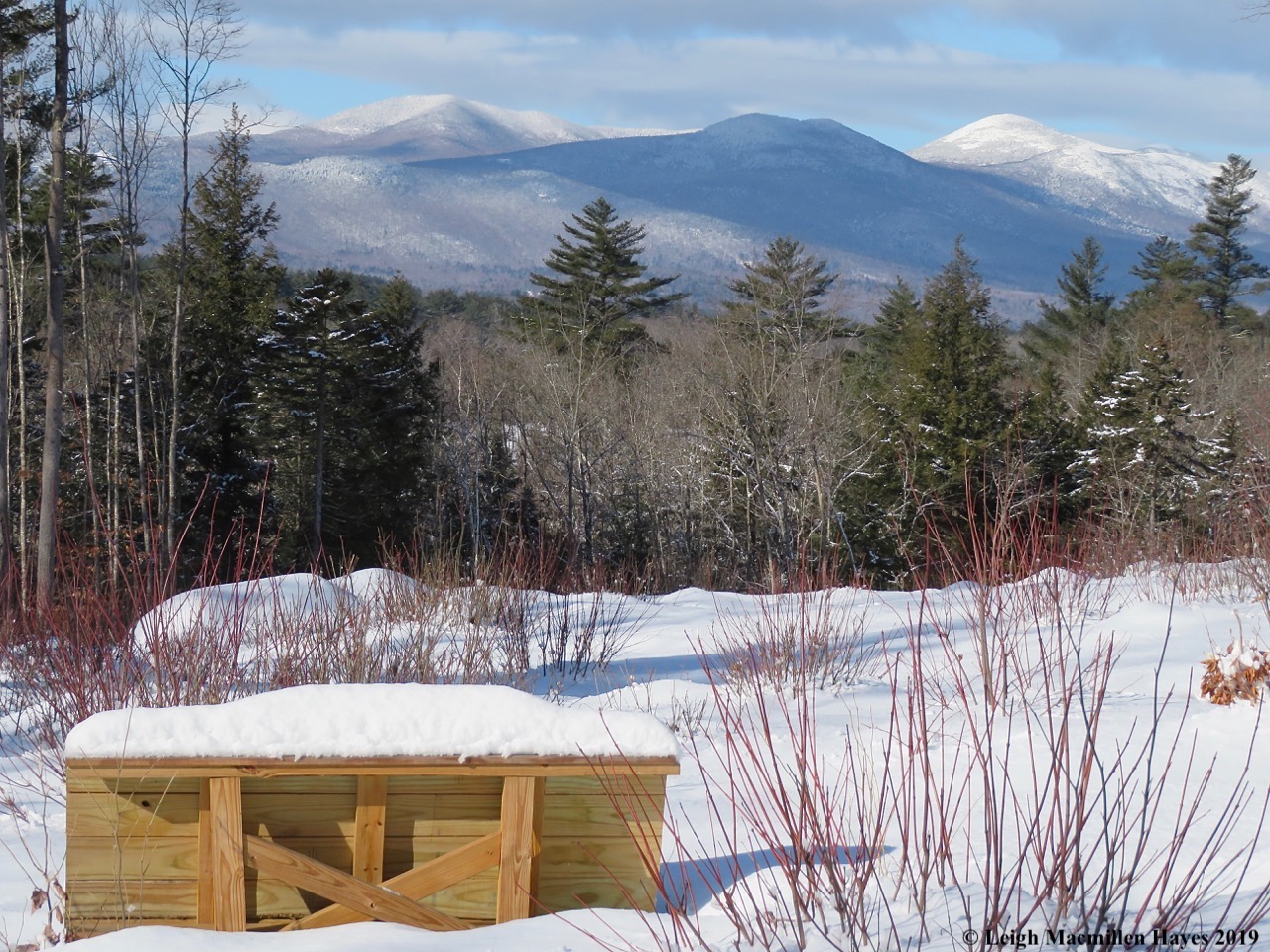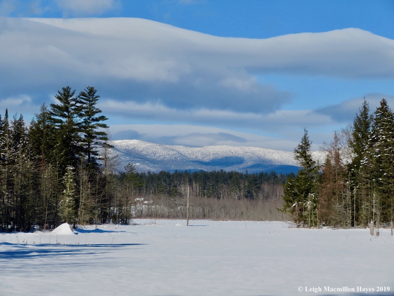 Before moving on again, I stood behind the second bench where the mountains in Evans Notch looked as if they’d been coated with frosting; and in the way of the winter world, they had.