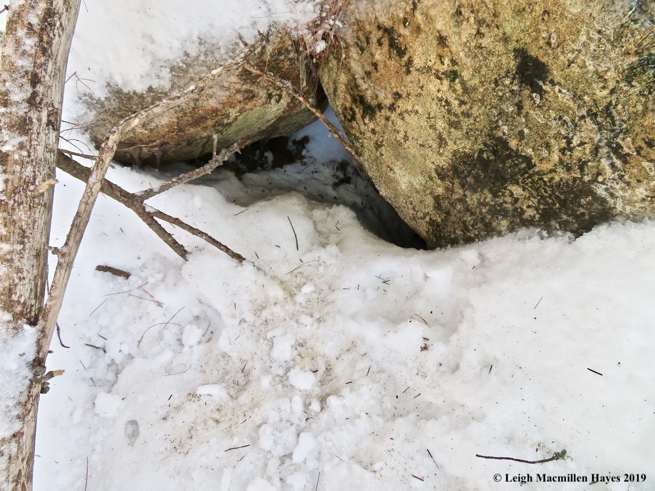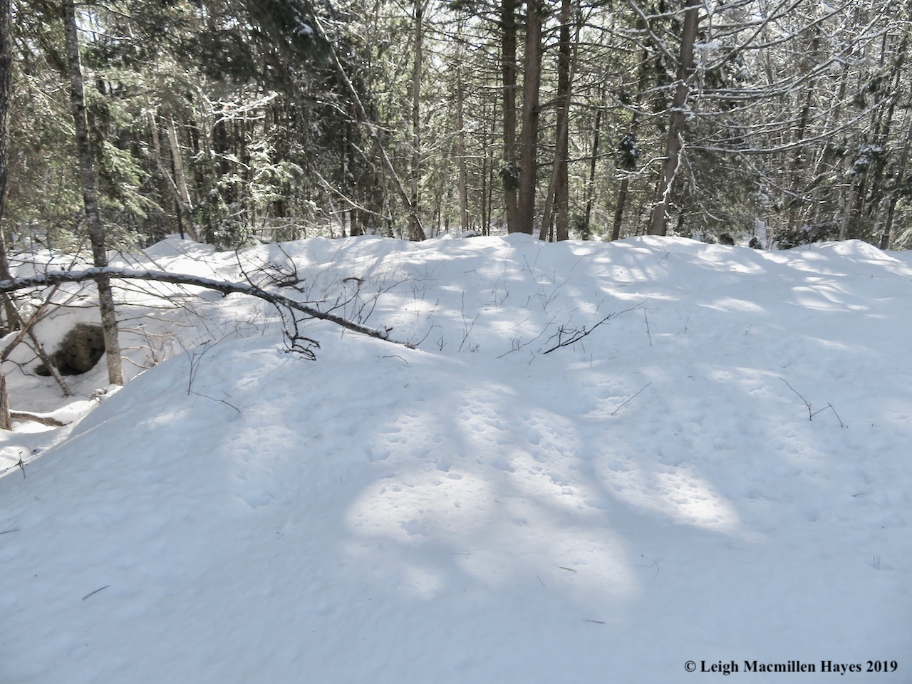And then I followed a seldom used trail back down to the brook, where I spied a fox track. Do you see it? It’s about in the lower middle of the photograph.