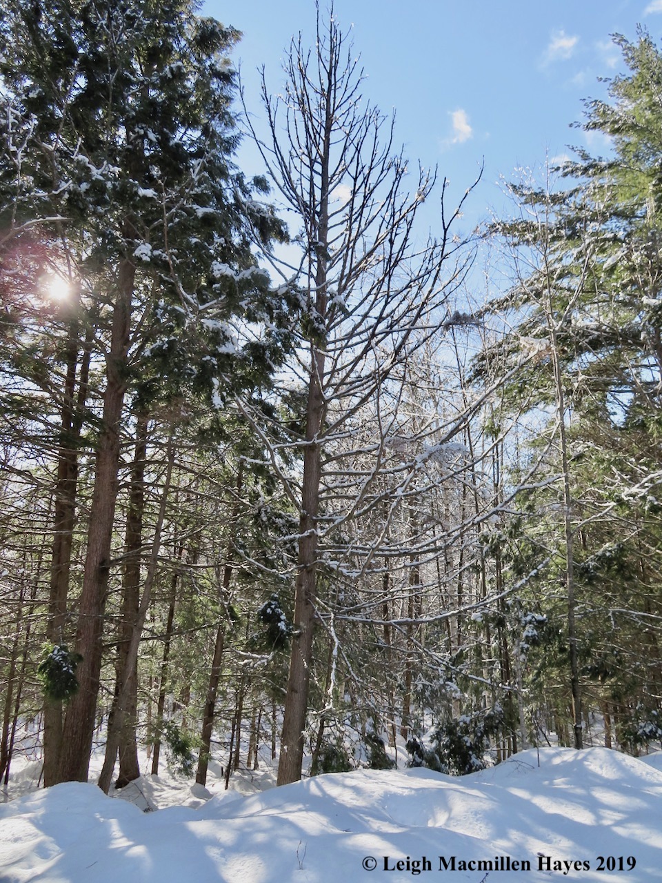 As I stood there, I searched again for any quilled critters, but saw none. What I did see–that only a skeleton of a hemlock remained. It’s a tree the porcupines have spent more than several years denuding.