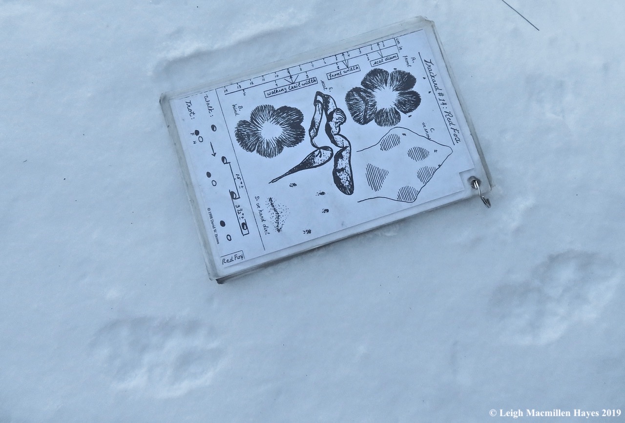 How did I know it was a red fox and not gray? Well, first I measured the print size, straddle, and stride. And then I looked at the foot morphology as presented in the snow. The prints were a bit muffled, which is one aid in identification, for a red fox has hairy feet. And . . . I spied the chevron, a little indented ridge that appears in the foot pad. If you look at David Brown’s Trackard in the previous photograph, you’ll see the chevron as a dark line.