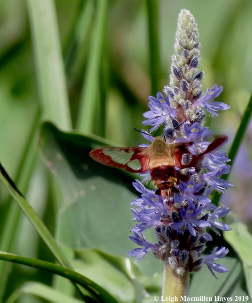 It’s just the opposite for the Clearwing Hummingbird Moth, who has a long proboscis like a butterfly that extends into the flowers to seek nectar. When in flight, the proboscis curls up and is tucked to the side of the moth’s head.