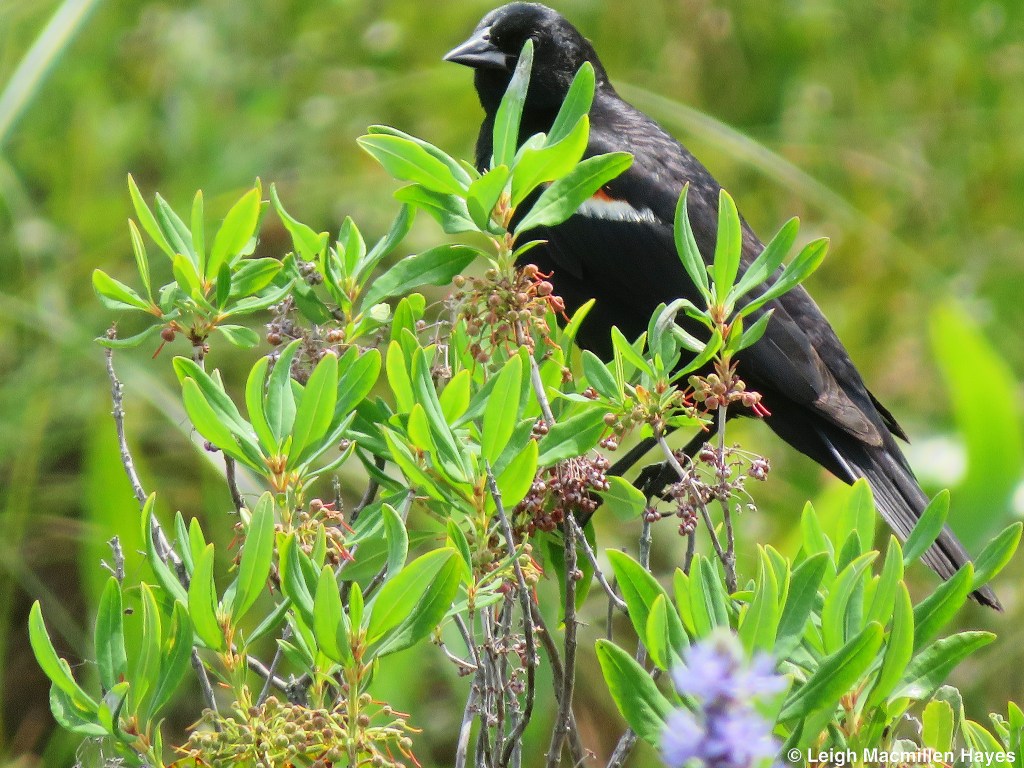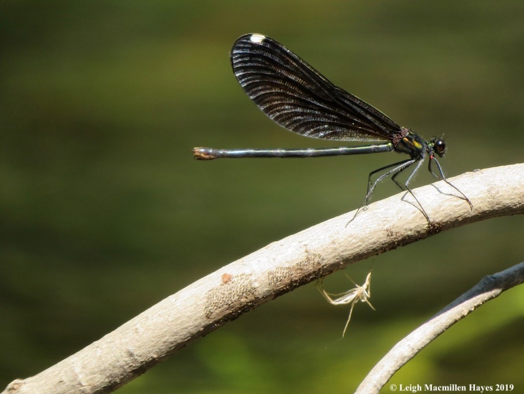 Among the damelflies, there are also broad-winged varieties, such as this female Ebony Jewelwing. If you are near a stream or damp spot in the woods, be on the lookout for these beauties. And note the white stigmas on her wings. Her guy’s wings are all black.