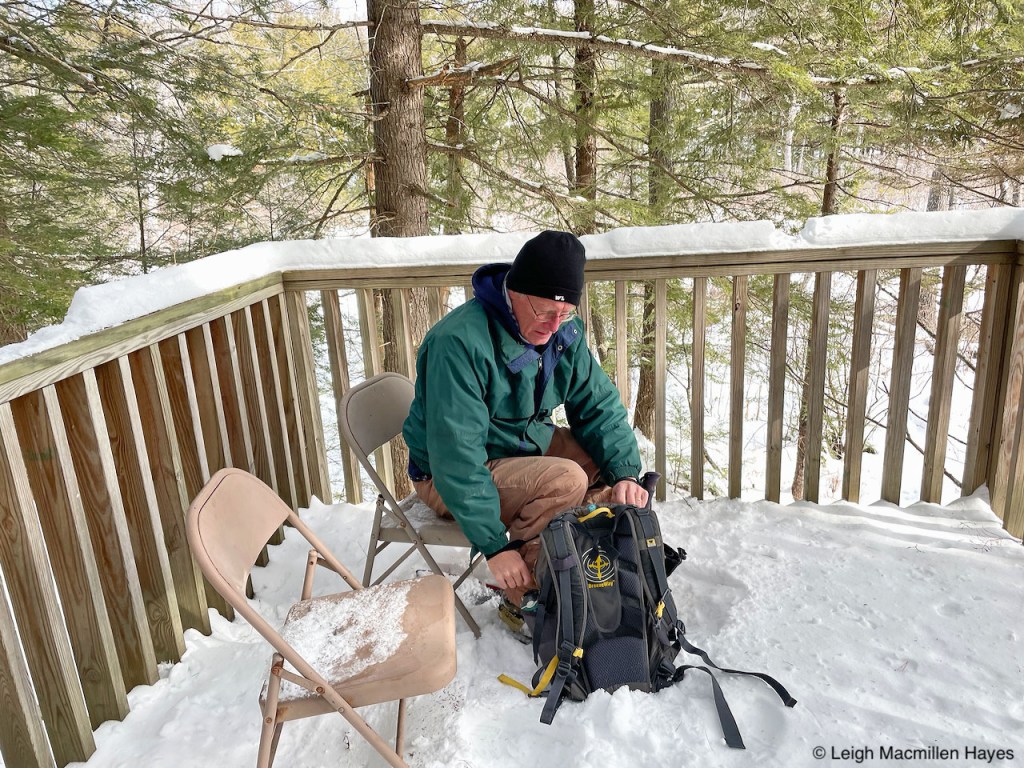 And then . . . and then . . . we spotted hoar frost between a couple of stacked logs . . . and surmised that our little friend was living in the space below. How cool is that? Wicked, in these parts of the woods.