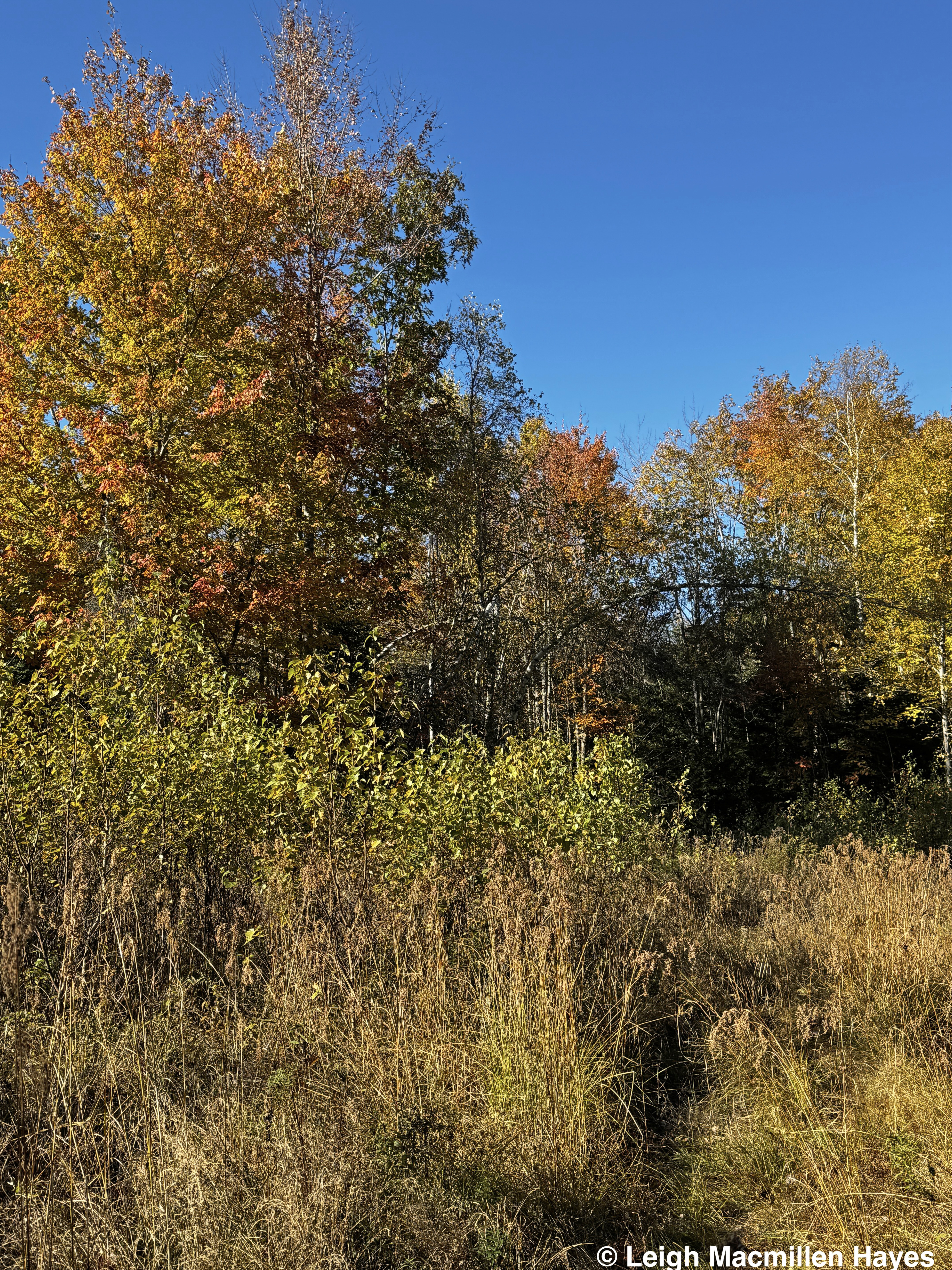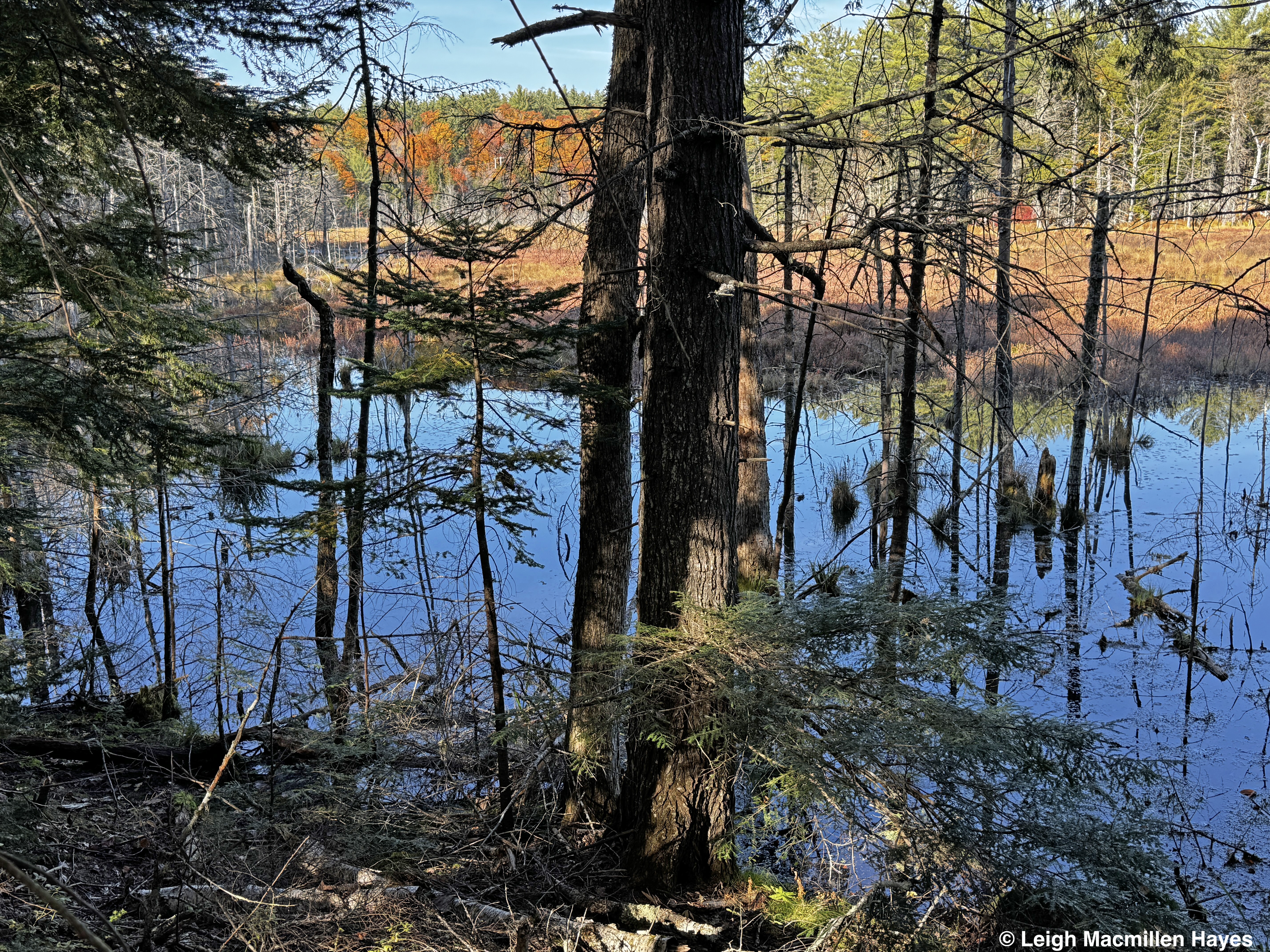 And with his drone we explore these areas we cannot easily access. This is one My Guy and I walked all the way around a few weeks ago without ever spying, though we knew it was there. But Bruce and I bushwhacked through a forest of White Pine Saplings and mature trees and reached the edge before he launched his bird and we were offered a glimpse of this most beautiful wetland with pockets of water connected by meandering rivulets.