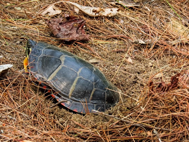 Or pausing briefly in the sun, such as this Pickerel Frog chose to do. Actually, it wasn’t so much basking as trying to remain hidden from my sight by not moving until I passed.