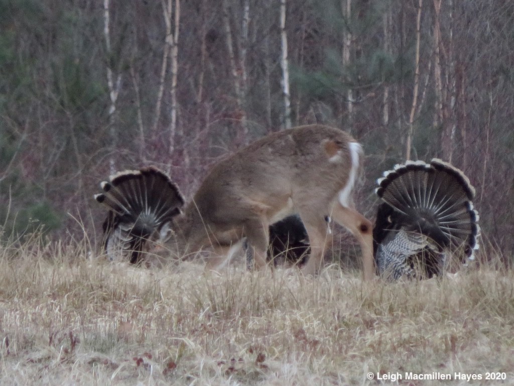 What to my wondering eyes should appear but three Tom Turkeys in full display and one deer.